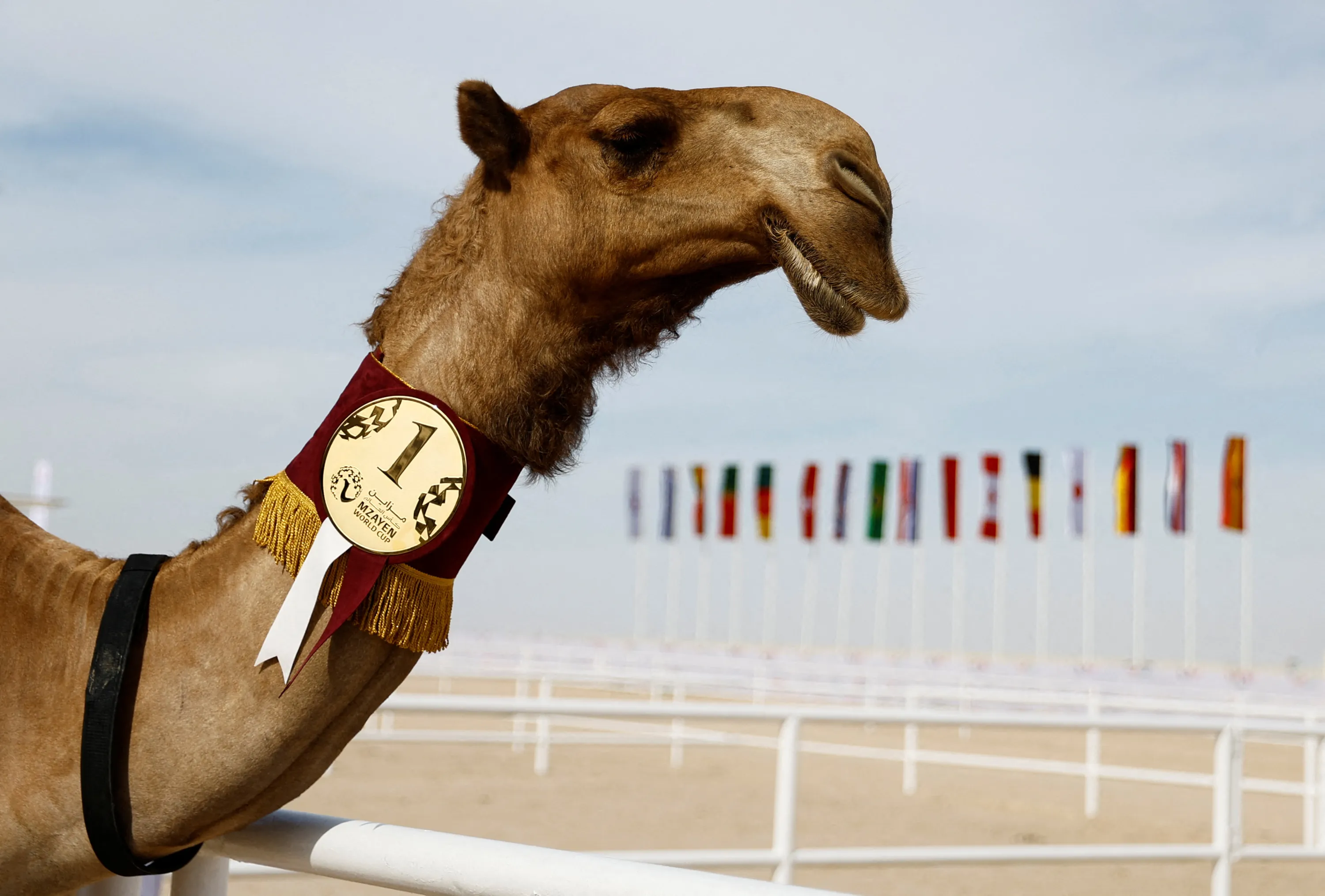 The first-place winner of a camel beauty contest poses for a photo at the 2022 FIFA World Cup, in Ash-Shahaniyah, Qatar on November 29, 2022. (Photo by Suhaib Salem/Reuters)