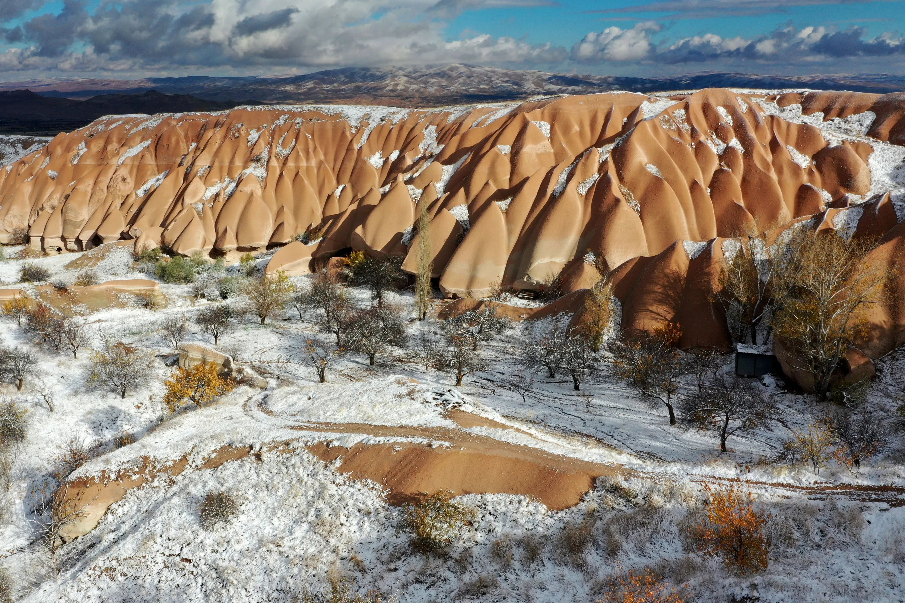 An aerial view of the snow covered fairy chimneys after snowfall in Cappadocia, which is preserved as a UNESCO World Heritage site and is famous for its chimney rocks, in Nevsehir, Turkiye on November 27, 2023. (Photo by Behcet Alkan/Anadolu via Getty Images)