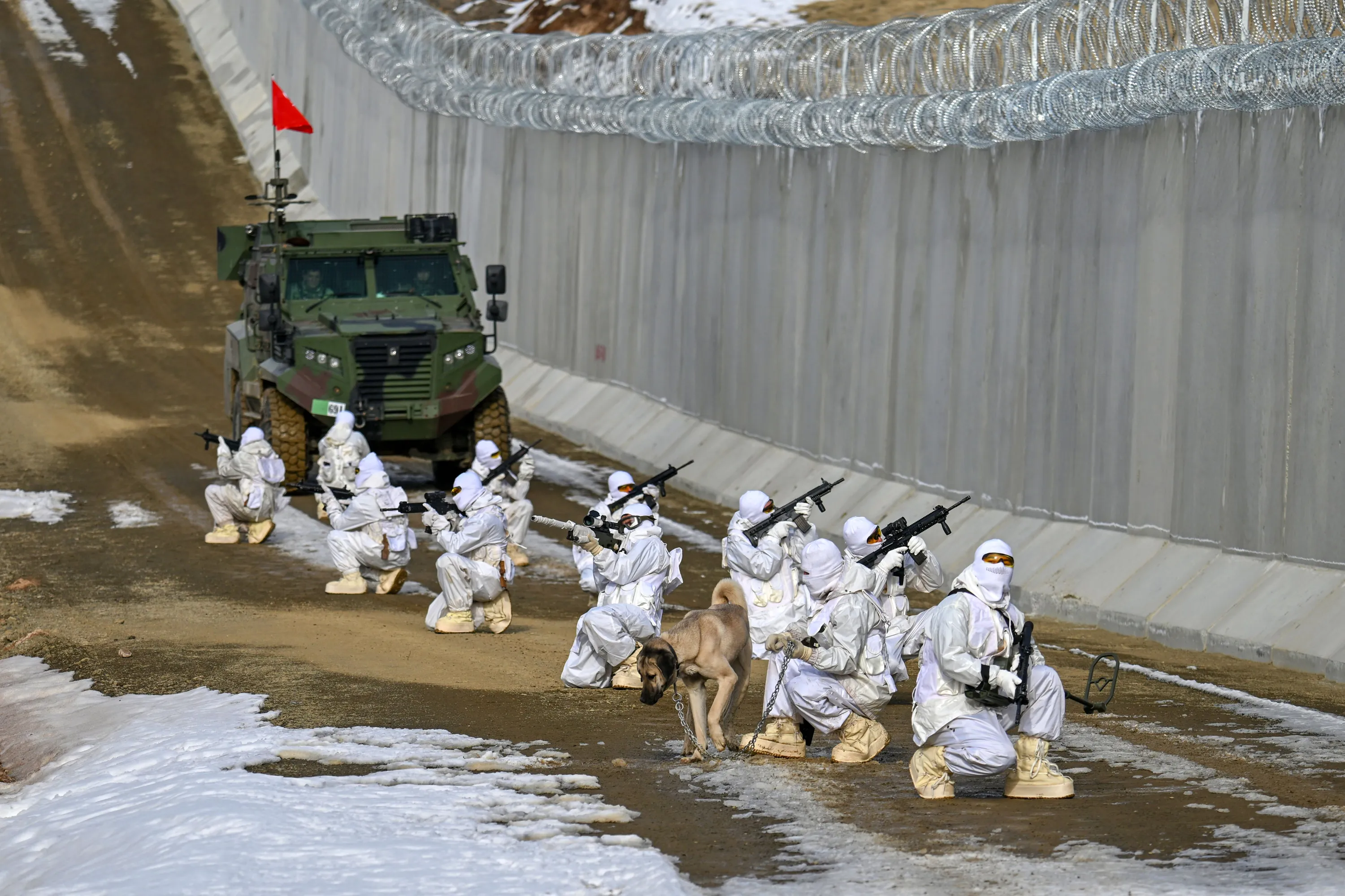 Security forces patrol around 170 kilometers of the security wall where built on the Iranian border to prevent illegal crossings, smuggling activities and terrorist infiltration in Van, Turkiye on December 04, 2023. Security measures are also kept at a high level in order to prevent crossing the border. Security forces, using all the means of technology, keep the border under constant control with the Sahingoz thermal camera developed by ASELSAN with domestic and national facilities and capable of detecting from a distance of 10 kilometers, ACAR Land Surveillance Radar System capable of detecting from a distance of 40 kilometers, SEDA Firing Location Detection System, thermal and PTZ cameras, lighting system and seismic sensors. (Photo by Ozkan Bilgin/Anadolu via Getty Images)