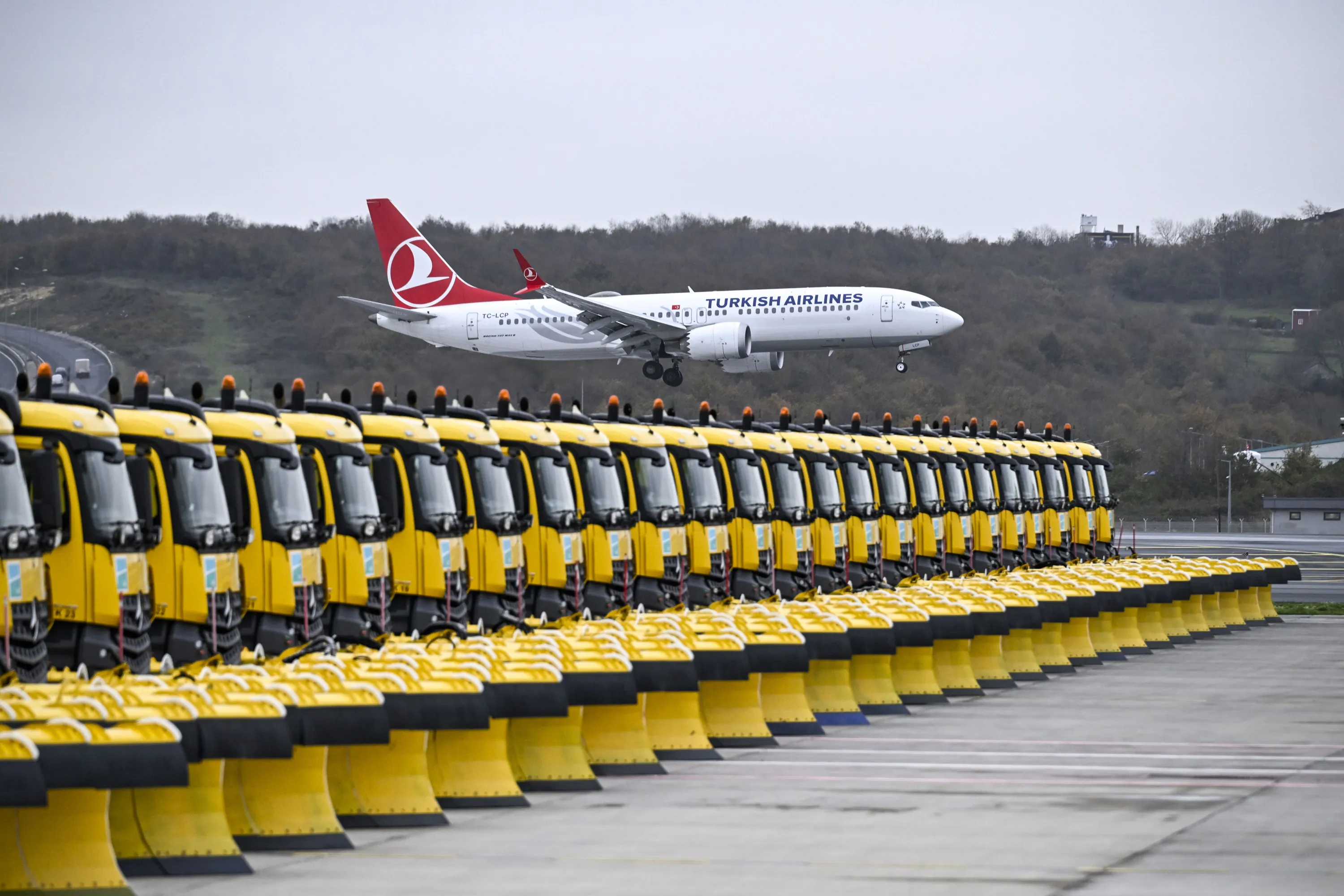 A view of an airplane as the winter preparations are completed to prevent adverse weather conditions to affect any flight traffic and to ensure that the passengers can travel comfortably and safely at the Istanbul Airport in Istanbul, Turkiye on December 6, 2023. (Photo by Muhammed Enes Yildirim/Anadolu via Getty Images)