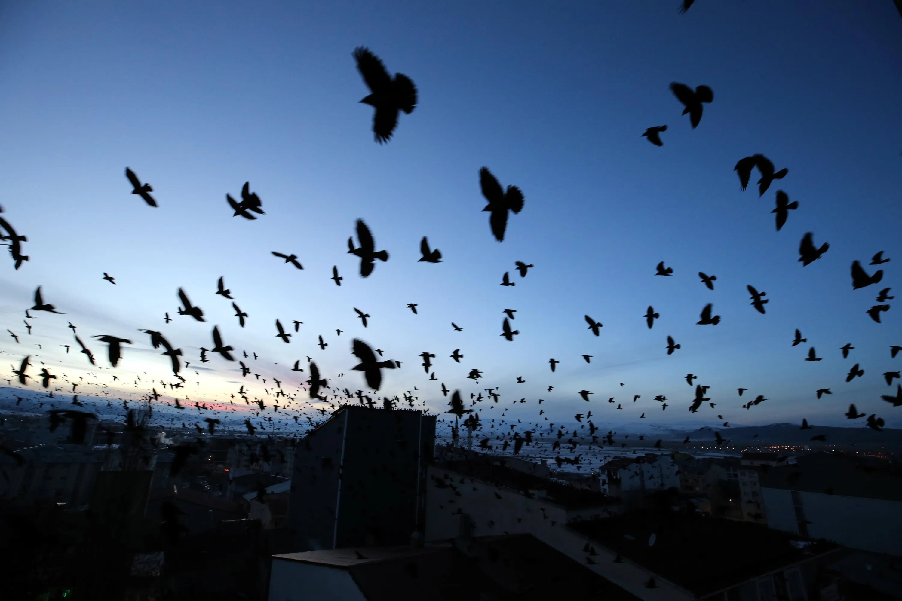 Birds fly during the sunset in Ardahan, Turkiye on December 07, 2023. (Photo by Gunay Nuh/Anadolu via Getty Images)