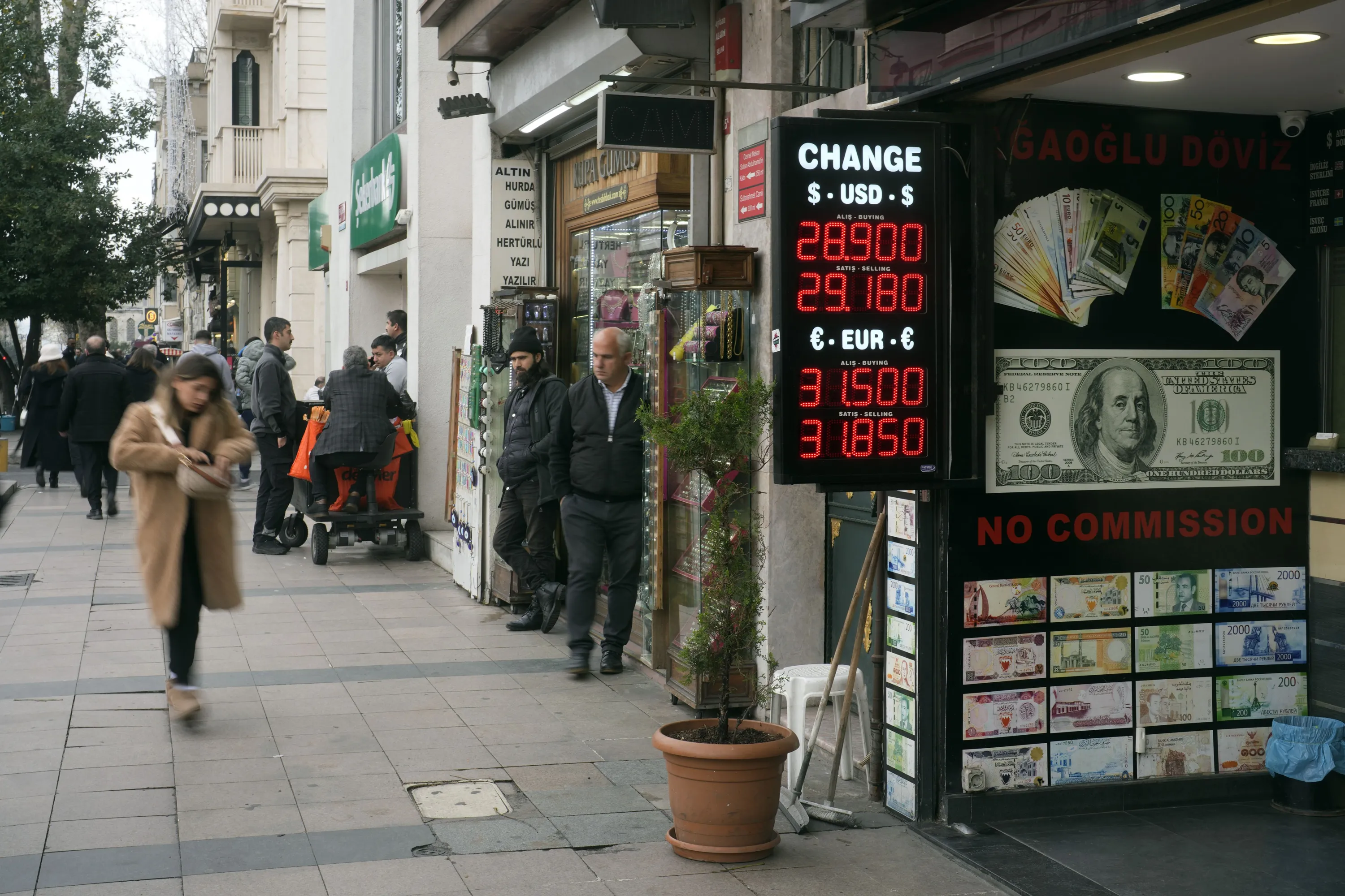 Peple walk next to an exchange currency shop in Istanbul, Turkey, Thursday, December 21, 2023. Turkey's central bank hiked its key interest rate by 2.5 percentage points on Thursday as part of its efforts to combat high inflation that has left many households struggling to afford rent and essential items. (Photo by Khalil Hamra/AP Photo)