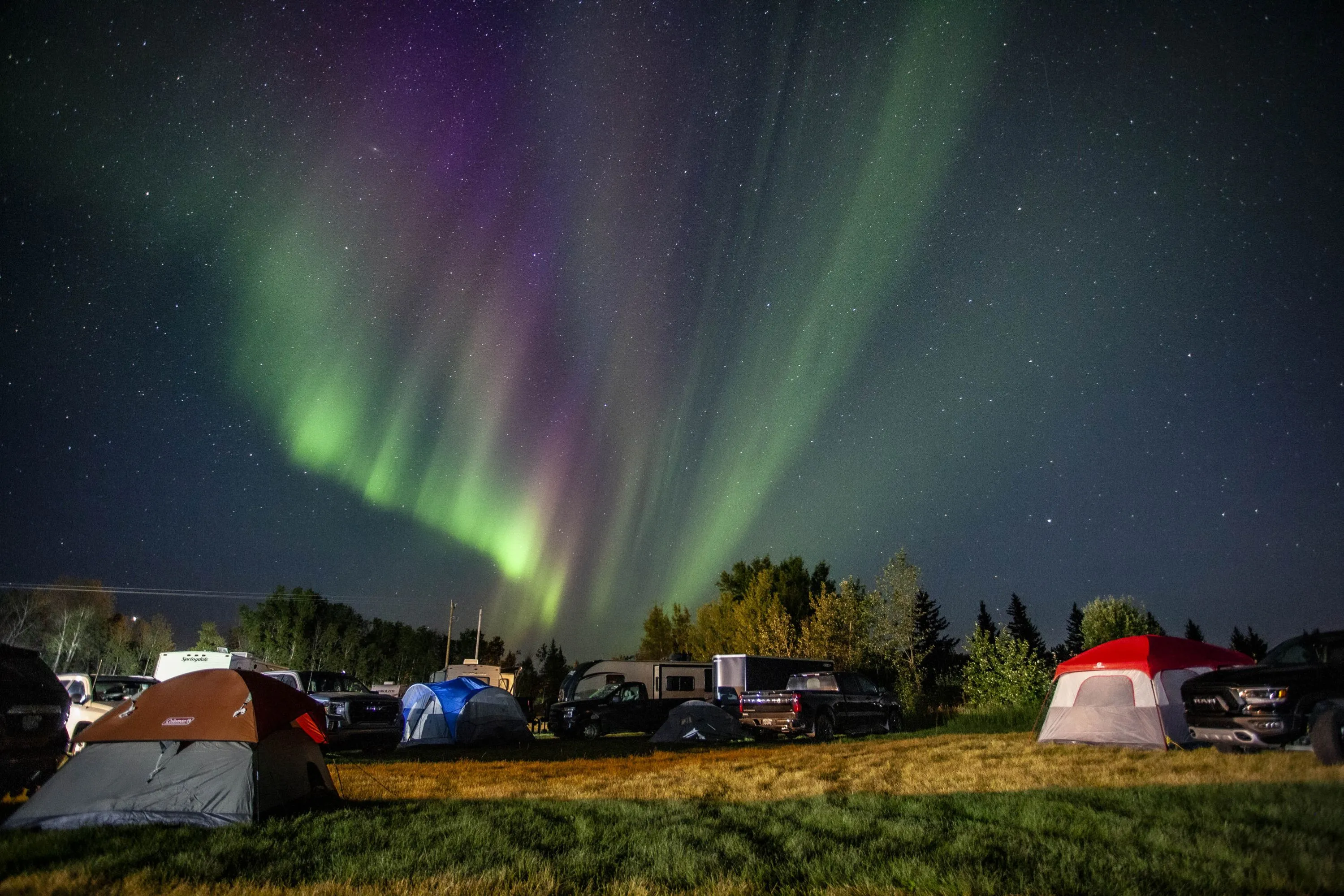 Evacuees from Yellowknife, territorial capital of the Northwest Territories, are greeted with the Aurora Borealis as they arrive to a free campsite provided by the community in High Level, Alta., Friday, August 18, 2023. (Photo by Jason Franson/The Canadian Press via AP Photo)