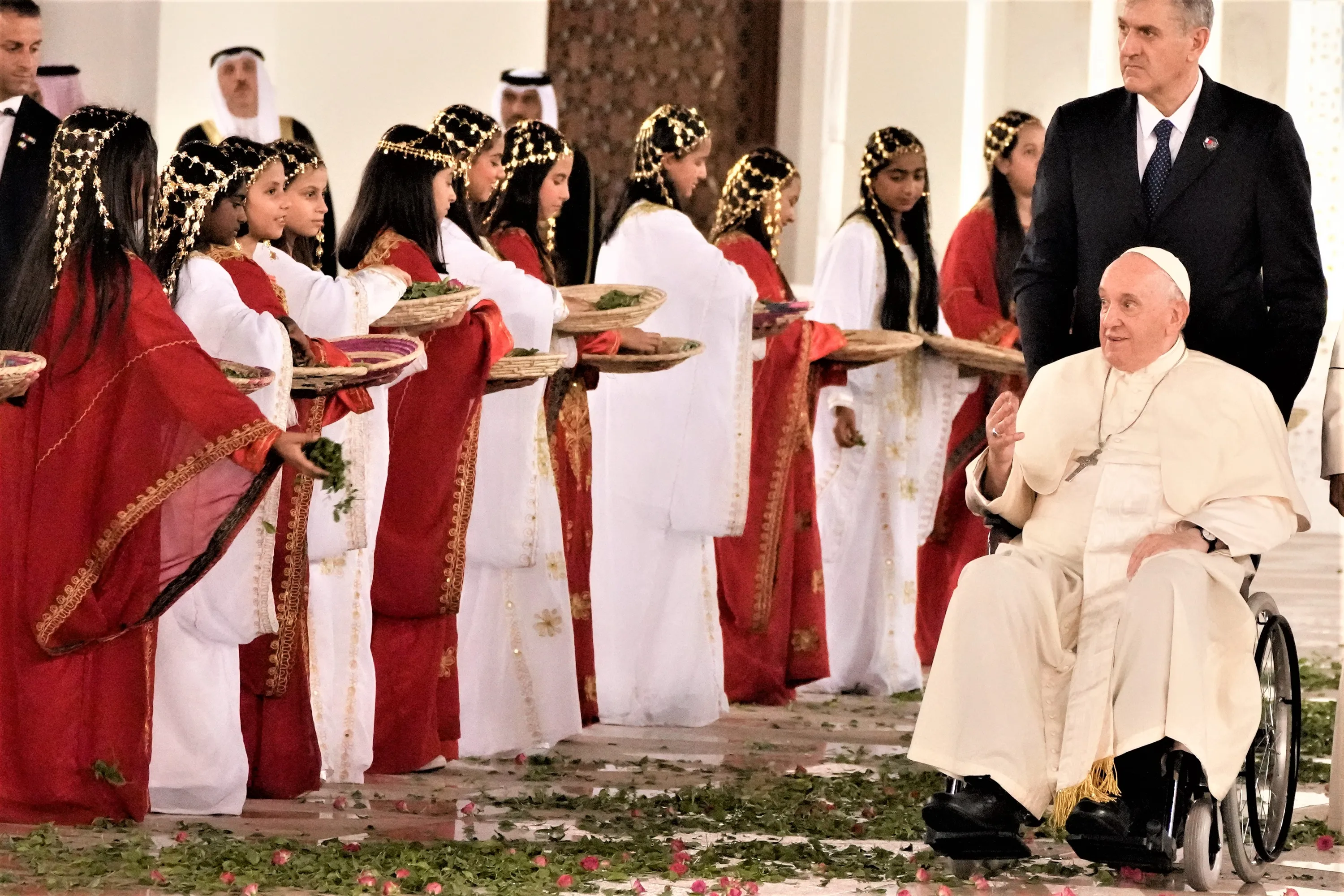 Pope Francis leaves the Sakhir Royal Palace after talks with Bahrain's King Hamad bin Isa Al Khalifa, Bahrain, Thursday, November 3, 2022. Pope Francis is making the November 3-6 visit to participate in a government-sponsored conference on East-West dialogue and to minister to Bahrain's tiny Catholic community, part of his effort to pursue dialogue with the Muslim world. (Photo by Alessandra Tarantino/AP Photo)