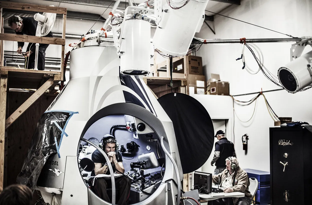 “Felix Baumgartner contemplates in the stratospheric capsule during an egress training in Lancaster, California, on February 22, 2012. On October 14, 2012 Austrian skydiver Baumgartner broke the world record for balloon and free-fall height and became the first person to break the sound barrier without propulsion. After jumping from a helium balloon over 39 kilometers into the stratosphere his free fall reached a speed of 1,342 kilometers per hour”. (© Balazs Gardi, Hungary/2013 Sony World Photography Awards)