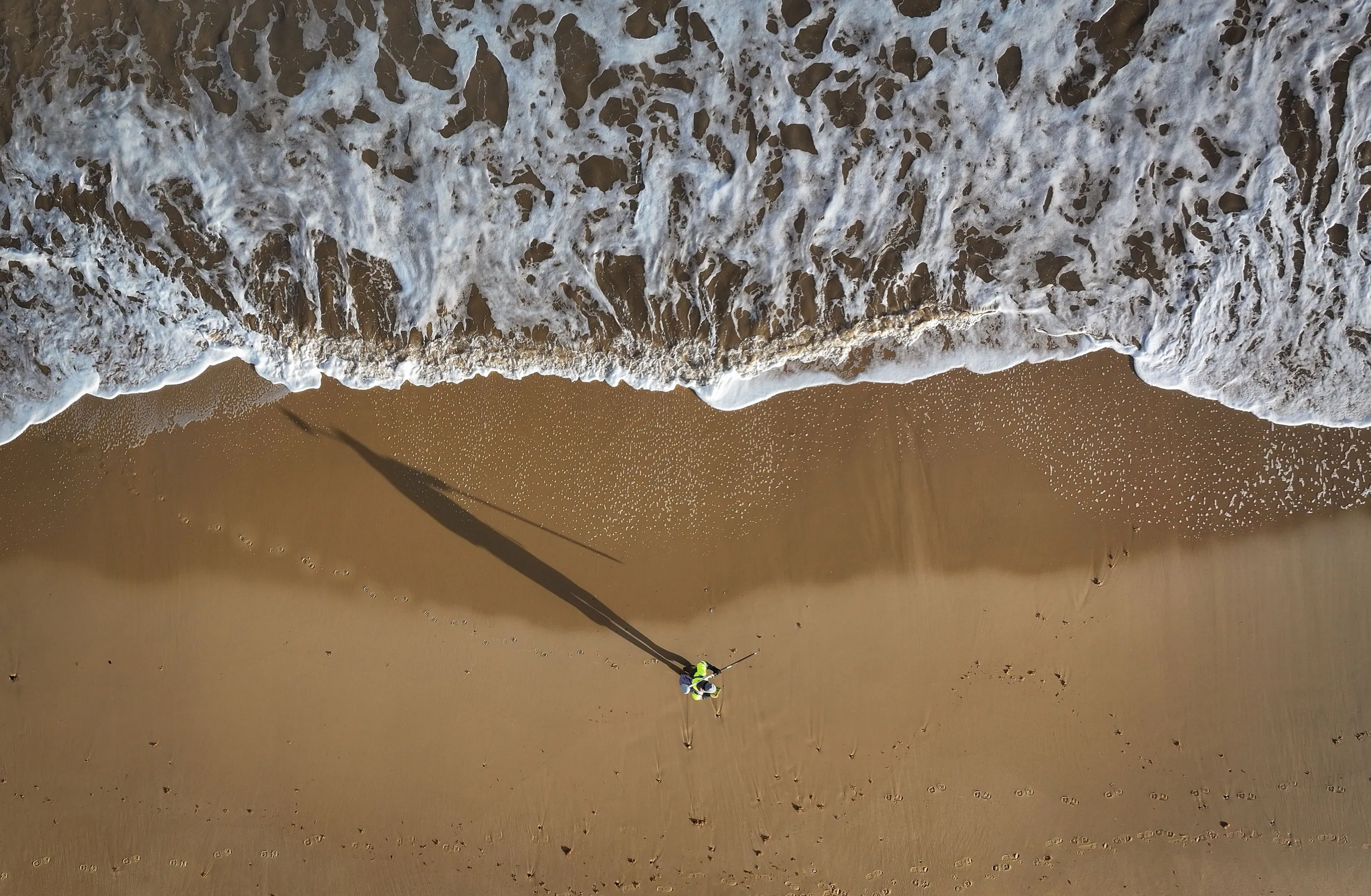 In this aerial view a land surveyor measures beach and sand erosion using GPS on Hemsby beach on December 11, 2023 in Hemsby, England. The collapse of a private access road in November, prompted by high tides and winds, led Great Yarmouth Borough Council to declare the rapidly eroding homes on The Marrams “not structurally sound and unsafe”. This demolition coincides with the 10th anniversary of five village houses lost to the sea in 2013 when storms undermined foundations by stripping away significant sand. (Photo by Christopher Furlong/Getty Images)