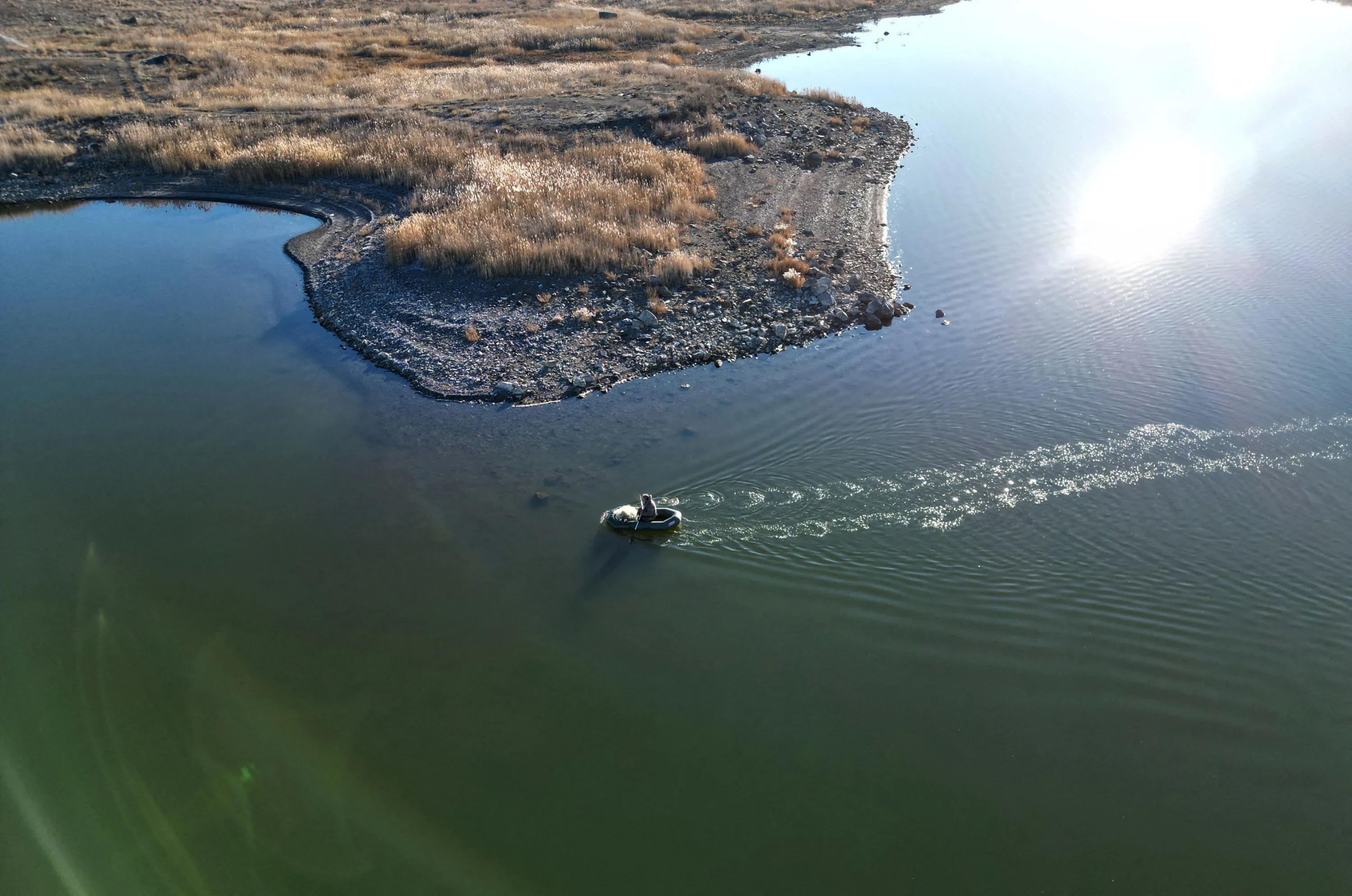 A man sails a boat on Lake Chagan, formed in 1965 as a result of a nuclear explosion at the Semipalatinsk Test Site, one of the main locations for nuclear testing in the Soviet Union, in the Abai Region, Kazakhstan on November 9, 2023. (Photo by /Pavel Mikheyev/Reuters)