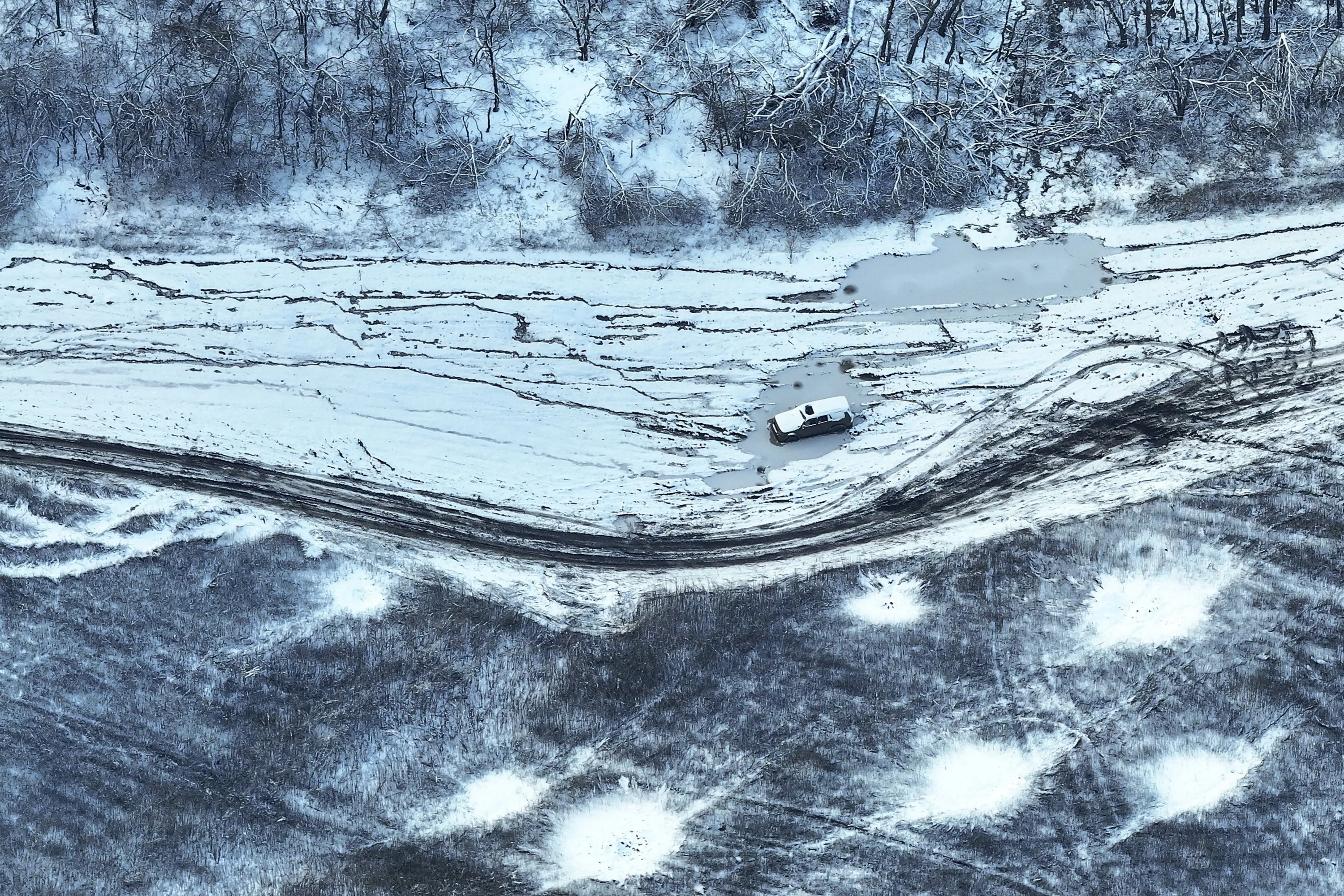 An aerial view of a car abandoned on the frontline close to Bakhmut, Donetsk region, Ukraine, Wednesday, November 22, 2023. (Photo by Alex Babenko/AP Photo)