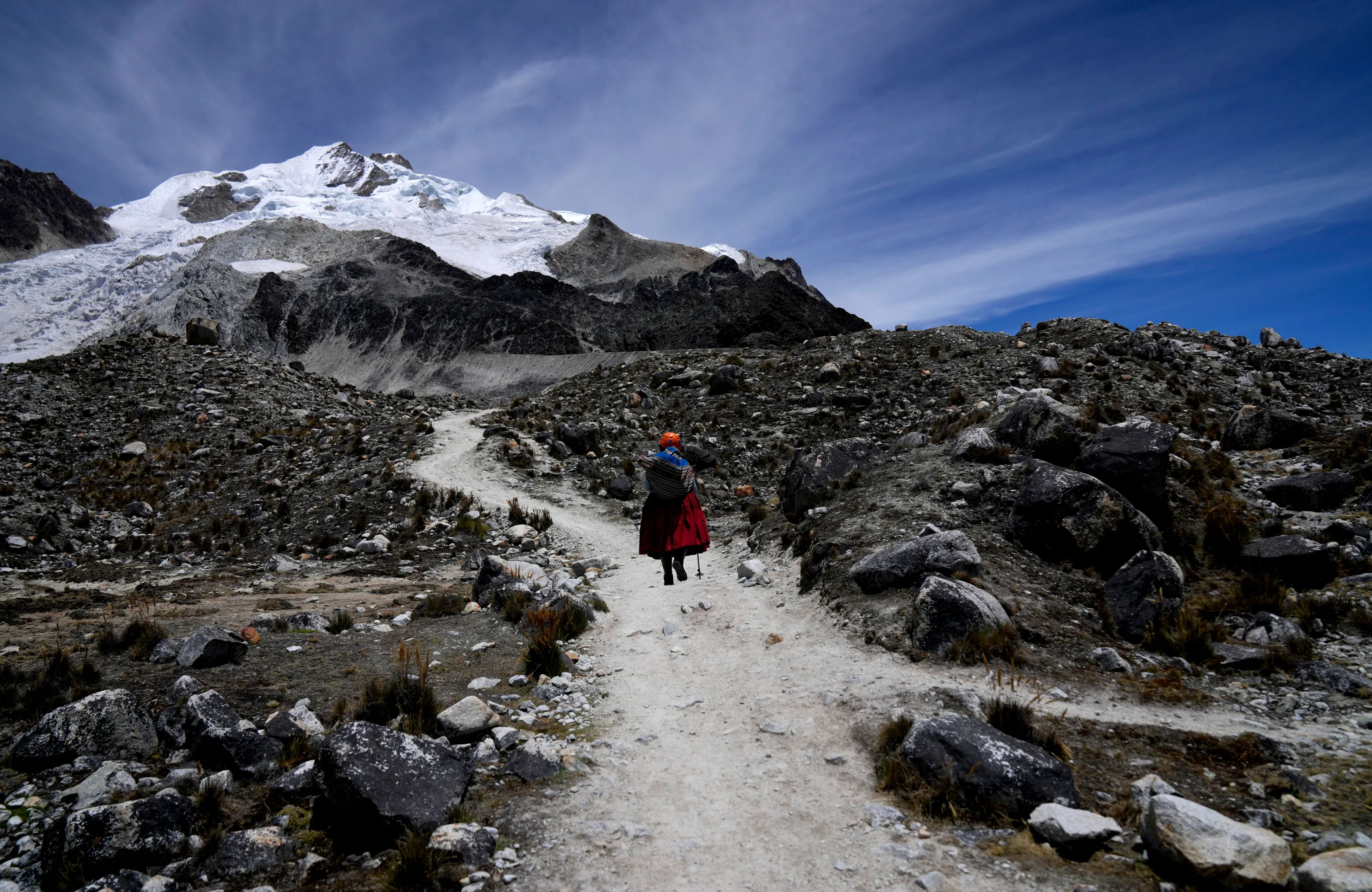 Cholita climber Suibel Gonzales walks towards the Huayna Potosi mountain snow-capped peak, near El Alto, Bolivia, Sunday, November 5, 2023. Dressed up on colorful, multilayered skirts, Gonzales is part of a group of 20 Indigenous Bolivian women who have been climbing the Andes peaks for the past eight years, working as guides for tourists. But as the glaciers in the South America country continue to retreat amid an increase in the average global temperature, they are worried about the future of their jobs. (Photo by Juan Karita/AP Photo)