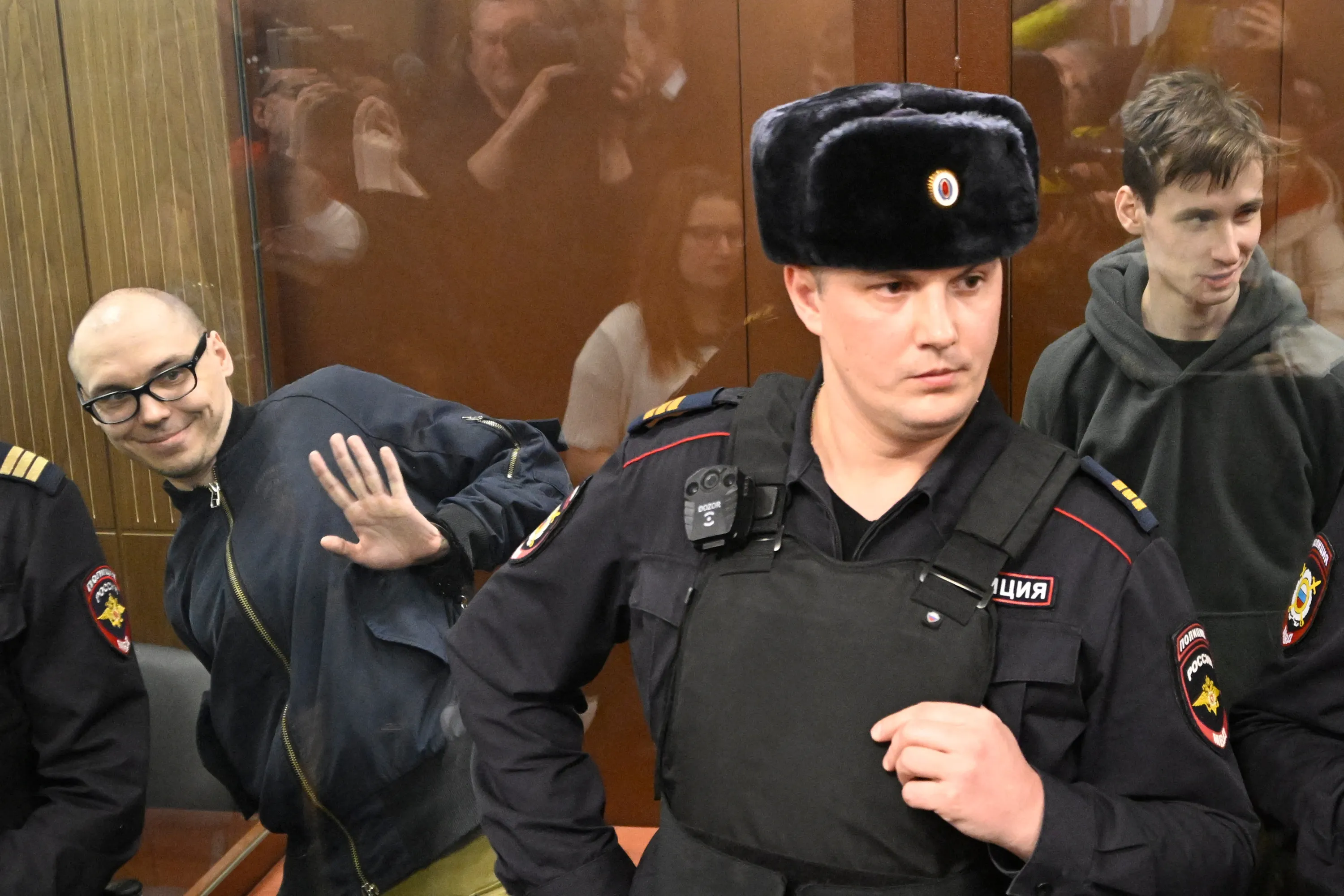 Russian poets Artyom Kamardin (L) and Yegor Shtovba (R) stand inside the defendants' glass cage during their verdict announcement at a court in Moscow on December 28, 2023. Russian poets Artyom Kamardin and Yegor Shtovba maintained their innocence but were sentenced to prison terms by Russian authorities, who have cracked down on any criticism of the military operation in Ukraine. (Photo by Alexander Nemenov/AFP Photo)