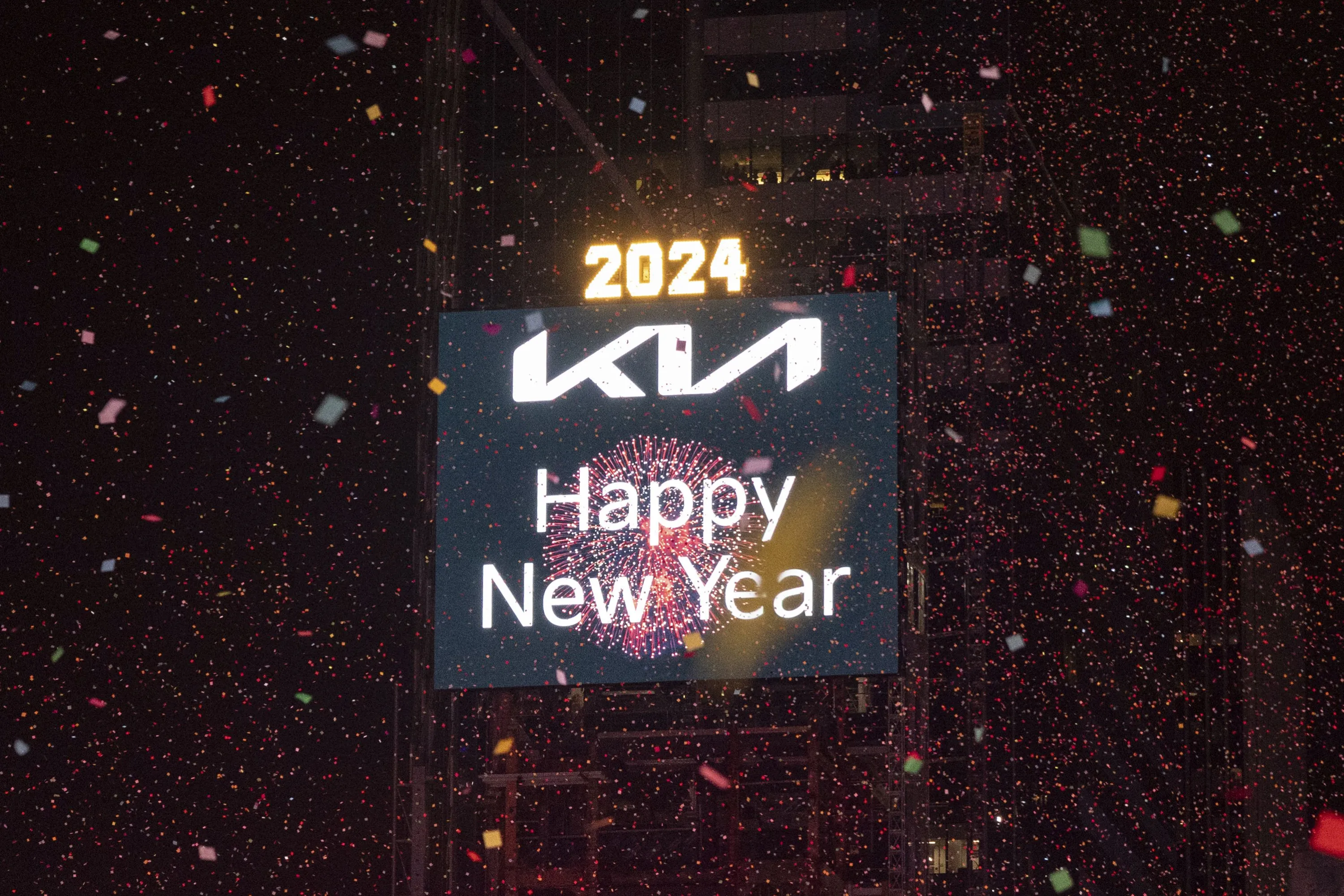 Confetti drops over the crowd as the clock strikes midnight as seen from the New York Marriott Marquis during the New Year's Eve celebration in Times Square, early Monday, January 1, 2024, in New York. (Photo by Yuki Iwamura/AP Photo)