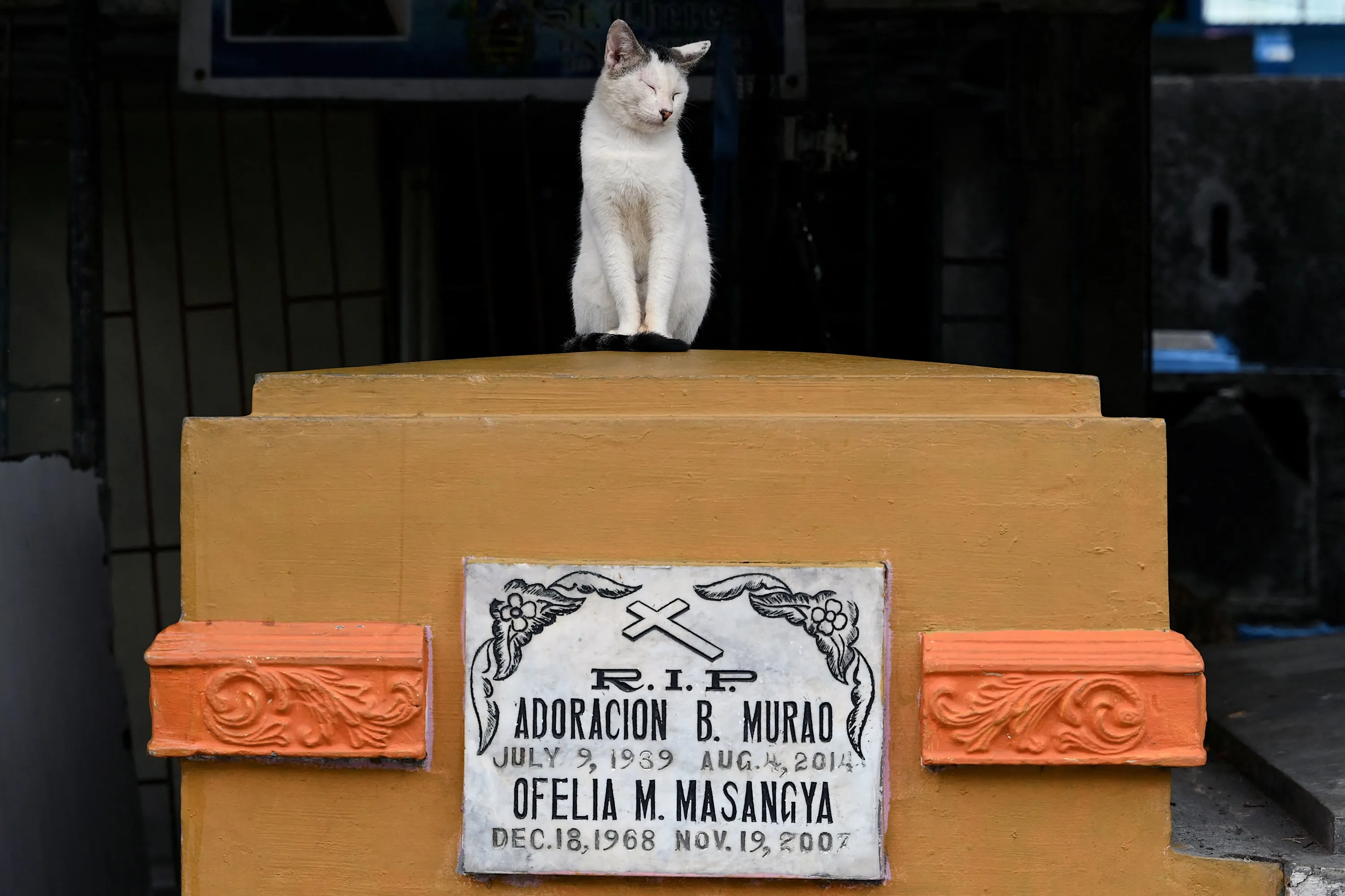 A cat sits on a tomb at Manila North cemetery on All Saints' Day in Manila on November 1, 2023. (Photo by Jam Sta Rosa/AFP Photo)