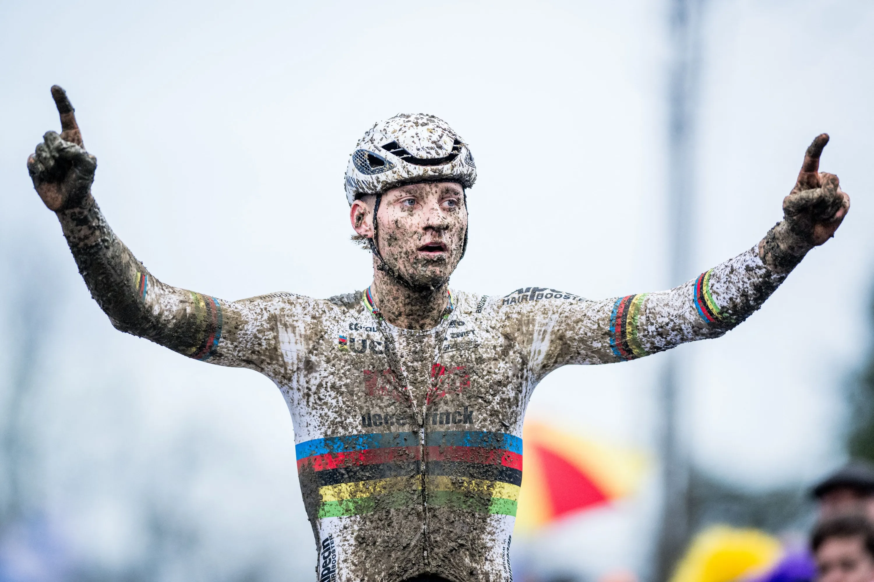 Dutch Mathieu Van Der Poel celebrates as he crosses the finish line to win the men's elite race of the 'GP Sven Nys' cyclocross cycling event, stage 4 out of 8 of the X2O Badkamers “Trofee Veldrijden” competition, in Baal on January 1, 2024. (Photo by Jasper Jacobs/Belga via AFP Photo)