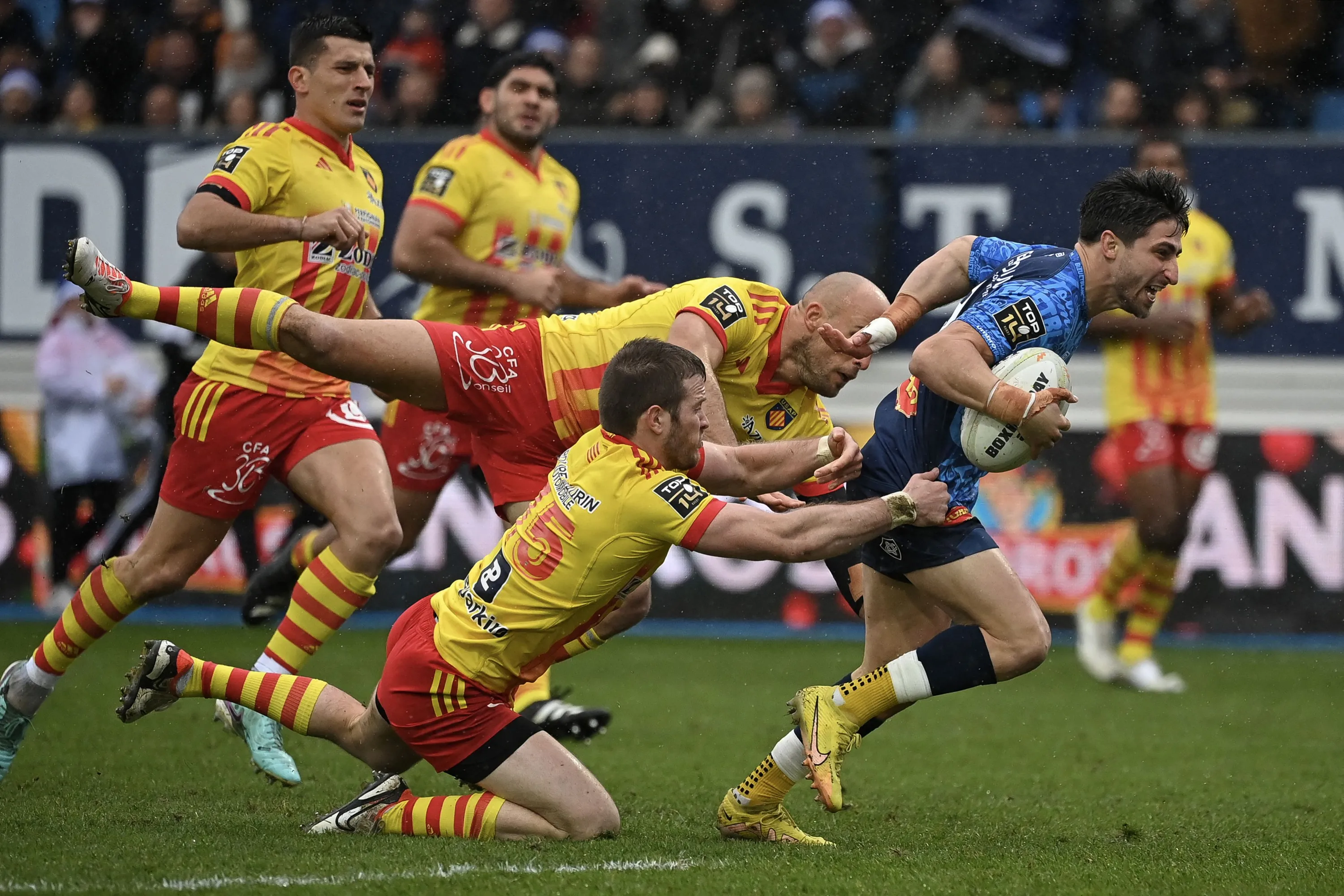 Castres' Uruguayan scrum-half Santiago Arata (R) runs with the ball during the French Top14 rugby union match between Castres Olympique and USA Perpignan at Pierre-Fabre Stadium, in Castres, south-western France, on December 31, 2023. (Photo by Valentine Chapuis/AFP Photo)