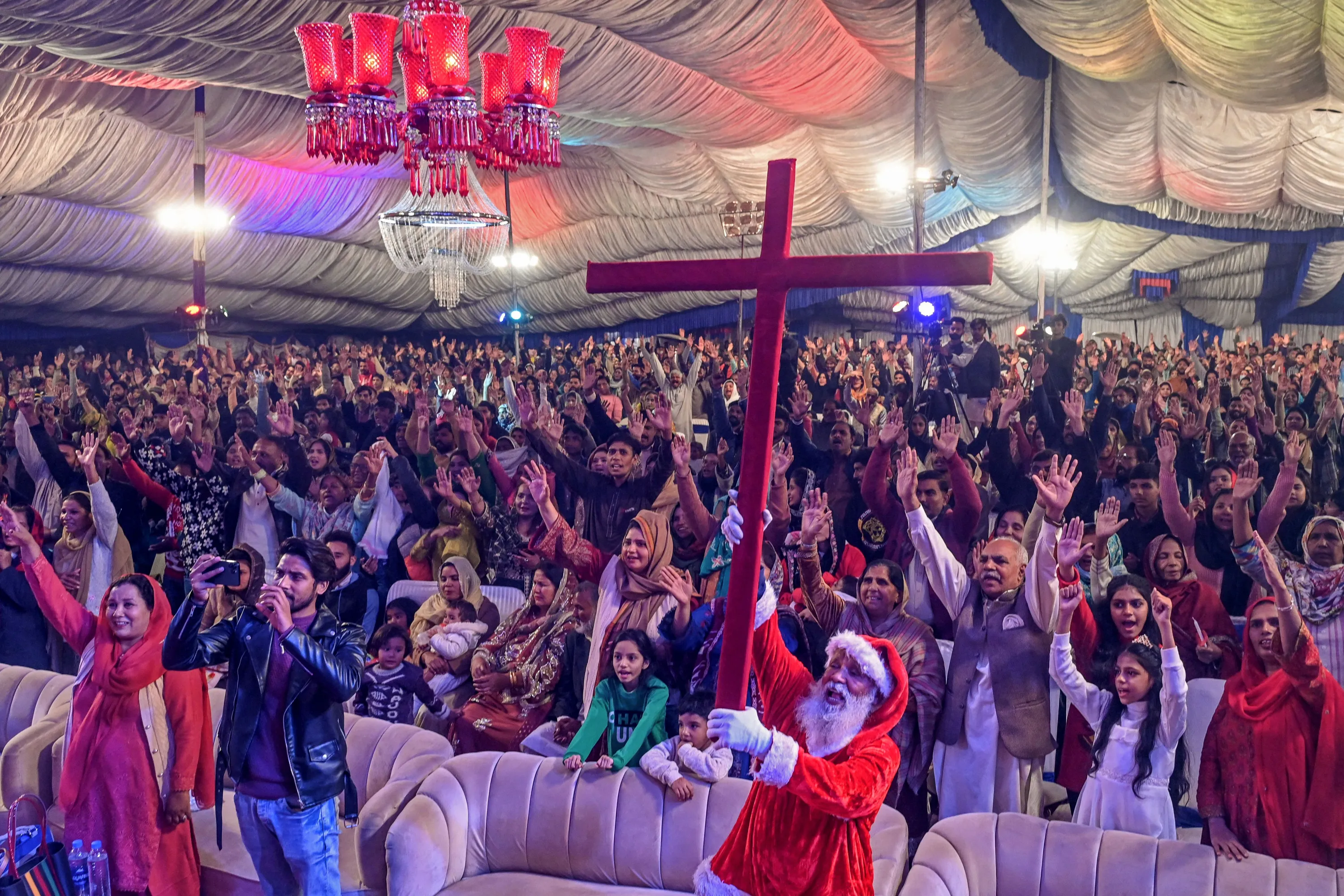 Christian devotees take part in a special mass ahead of Christmas, at a church in Lahore on December 20, 2023. (Photo by Arif Ali/AFP Photo)