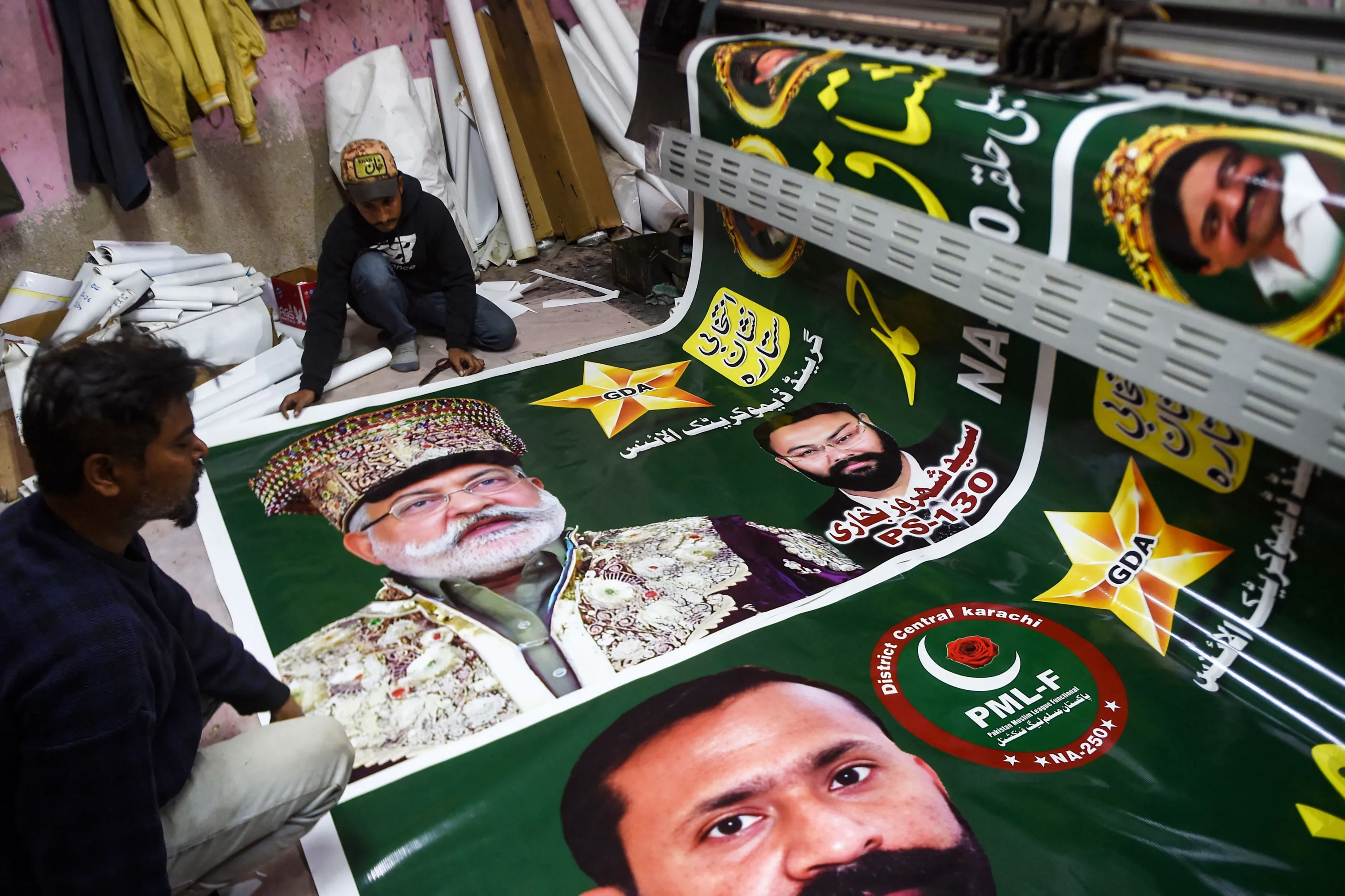 Workers print election posters of Pakistan Muslim League – Functional (PML-F) party at a printing press in Karachi on January 11, 2024, ahead of the country’s upcoming general elections. (Photo by Rizwan Tabassum/AFP Photo)