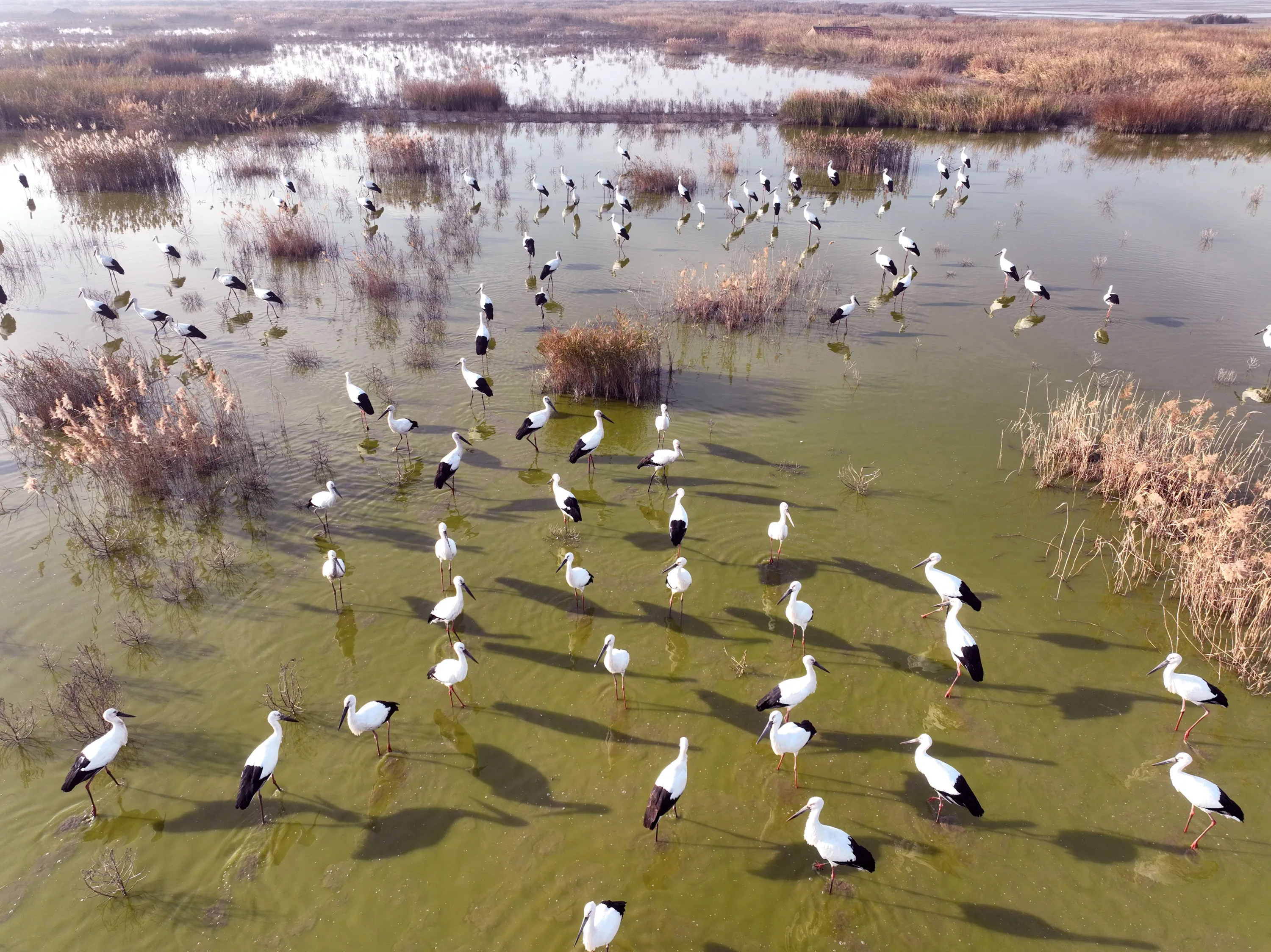 This aerial photo taken on December 9, 2023 shows a flock of oriental white storks foraging at a national ocean park in Lianyungang, east China's Jiangsu Province. (Photo by Xinhua News Agency/Rex Features/Shutterstock)