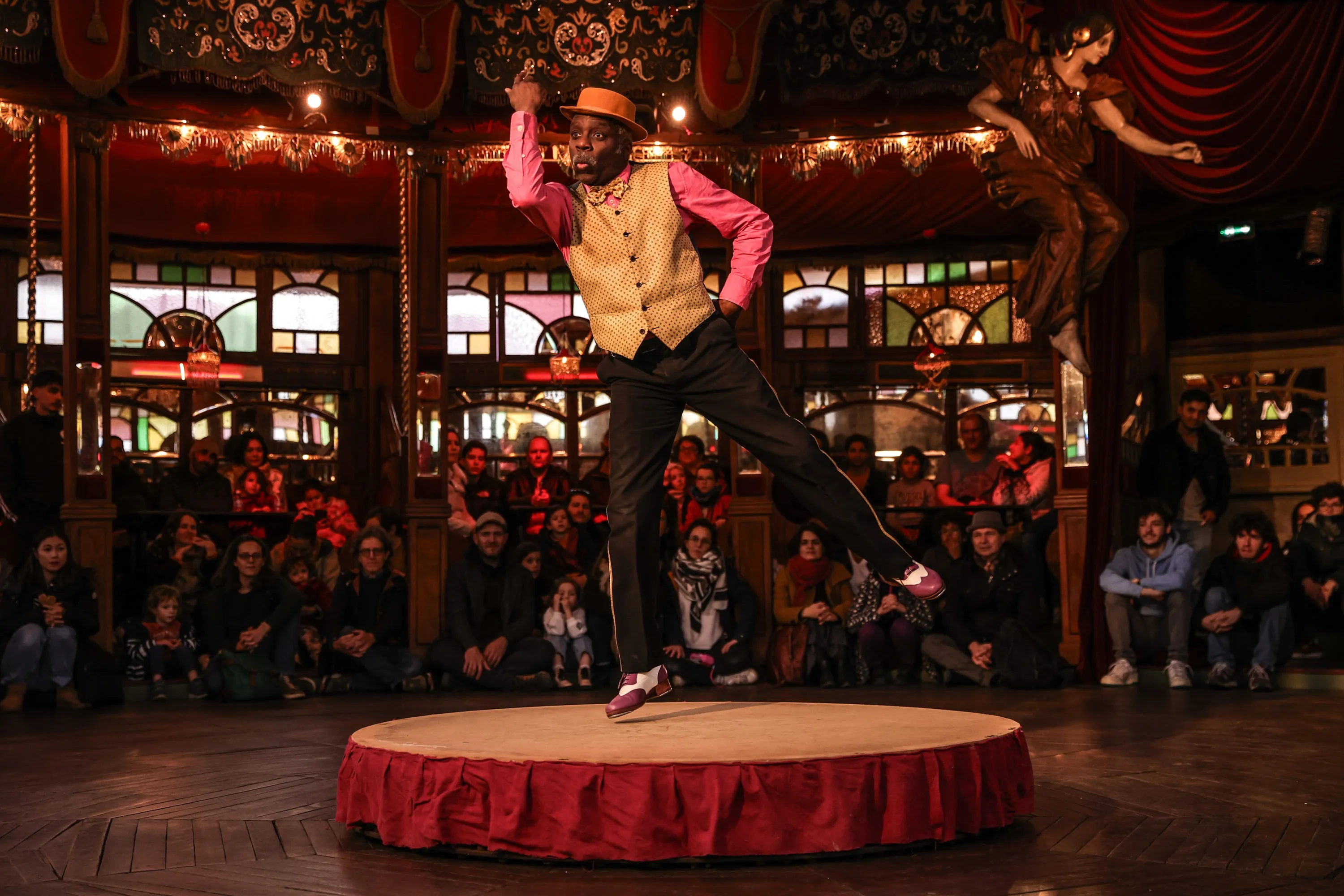 French tap dancer “Philou” performs a demonstration of Charleston dance during the 13th edition of the “Festival du Merveilleux” (Festival of the Marvelous) in Paris, France, 27 December 2023. The Museum of Fairground Arts gathers the largest private collection dedicated to the show and the fairground art from 1850 to 1930. Since 2009, the museum has been offering different events during the festival to recreate the fun and entertainment of the late 19th and early 20th century. This year's edition of the Festival du Merveilleux, running from 27 December 2023 to 07 January 2024, highlights the link between the Belle Epoque funfair and sporting activities. (Photo by Teresa Suarez/EPA/EFE)
