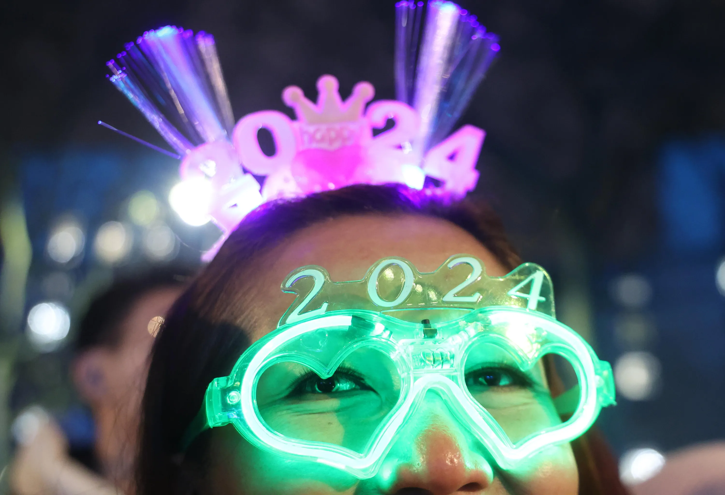 A reveller wears 2024 glasses during the New Year Eve firework celebrations on the River Thames in London, Britain on December 31, 2023. (Photo by Neil Hall/EPA/EFE)