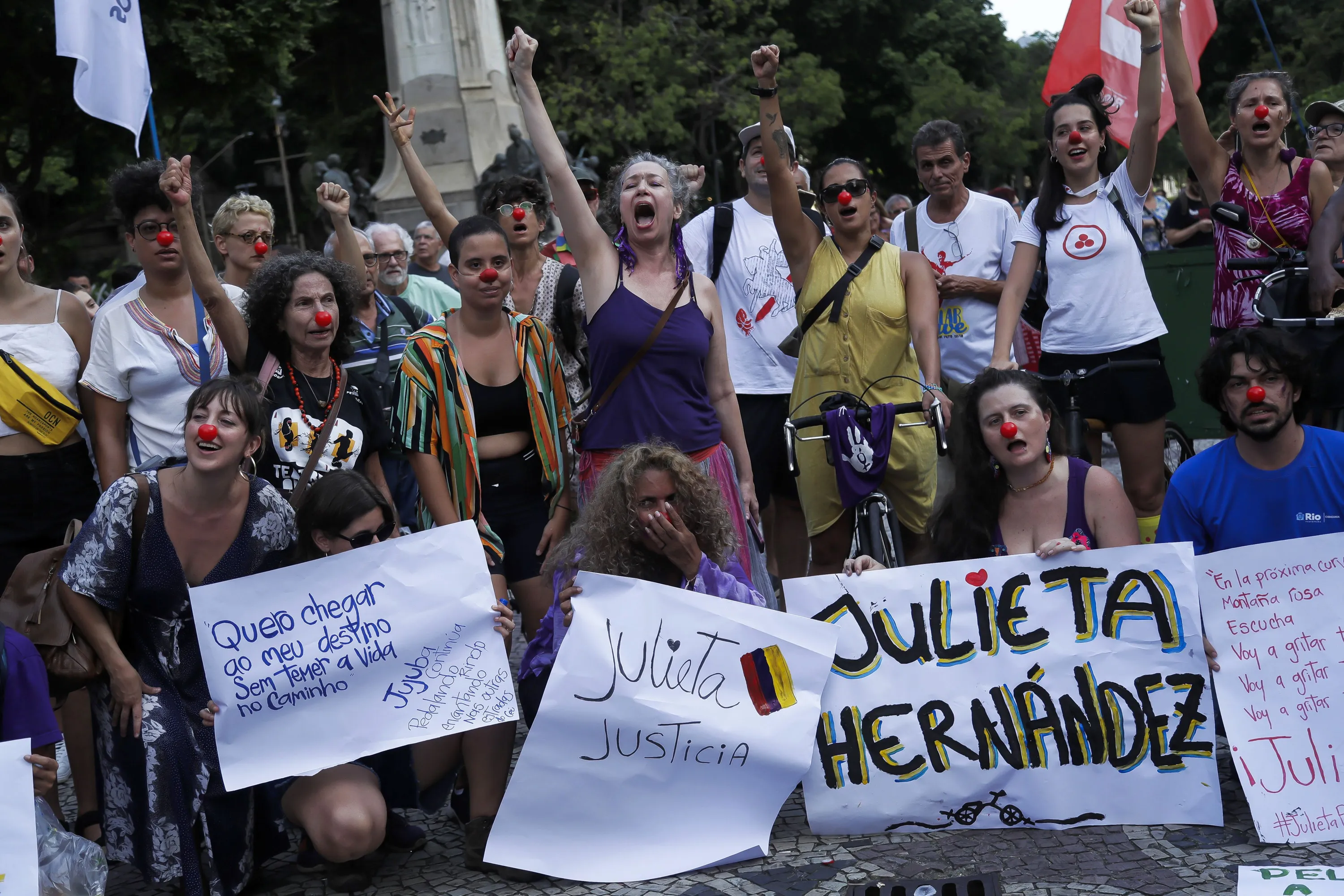 Artists protest violence against women after the murder of Venezuelan actress and clown Julieta Inés Hernández Martínez in Rio de Janeiro, Brazil, Monday, January 8, 2024. The body of Hernández, who had been missing since Dec. 23 while traveling by bicycle, was found in Presidente Figueiredo city, near Manaus in Amazonas state. (Photo by Bruna Prado/AP Photo)