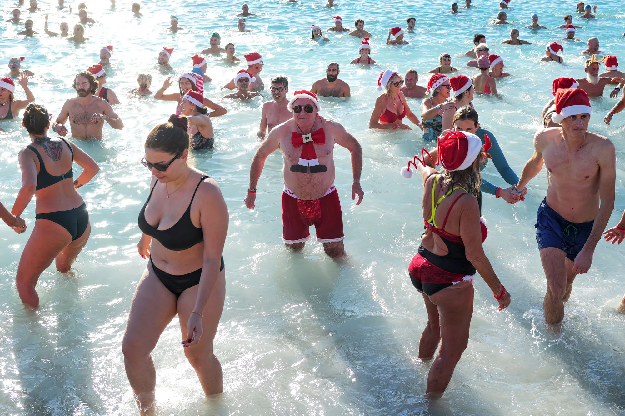 Bathers take part in the traditional Christmas bath in Nice, on the French Riviera, on December 17, 2023. (Photo by Valery Hache/AFP Photo)