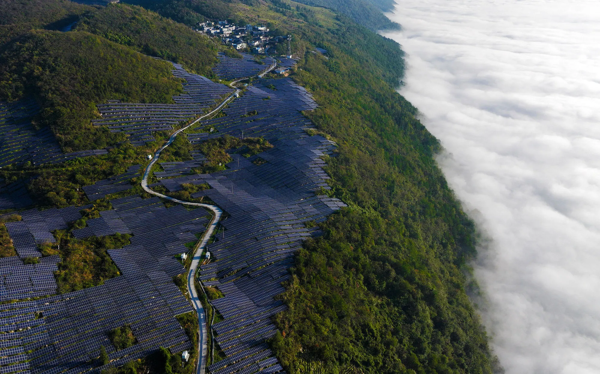 Aerial view of wind turbines and solar panels at a wind and solar hybrid power generation plant on a mountain on October 30, 2023 in Chongqing, China. (Photo by VCG/VCG via Getty Images)