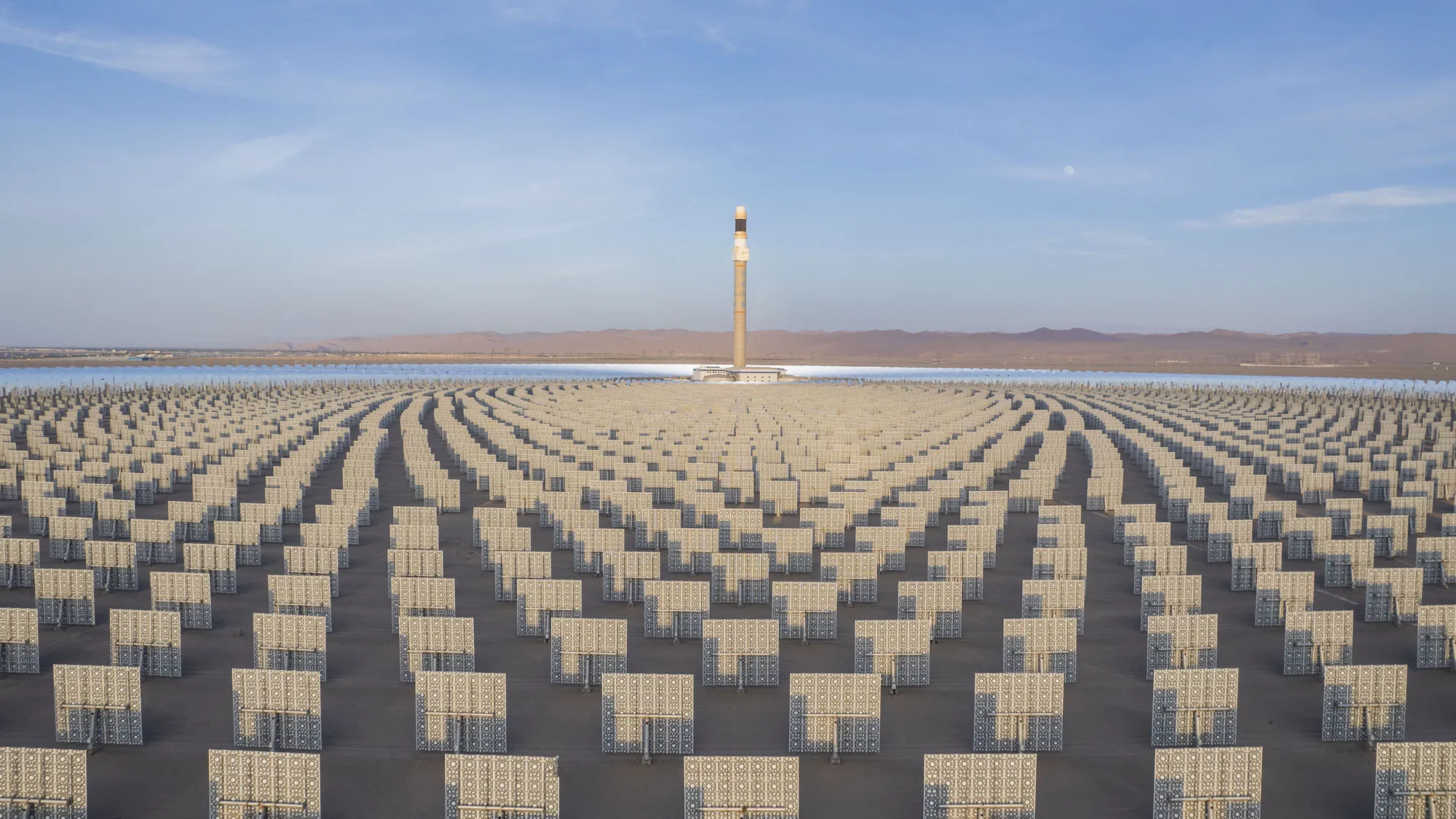 A part view of a Molten Salt Tower Solar Thermal Power Station is seen on June 02, 2023 in Jiuquan, China. (Photo by Hu Chengwei/Getty Images)