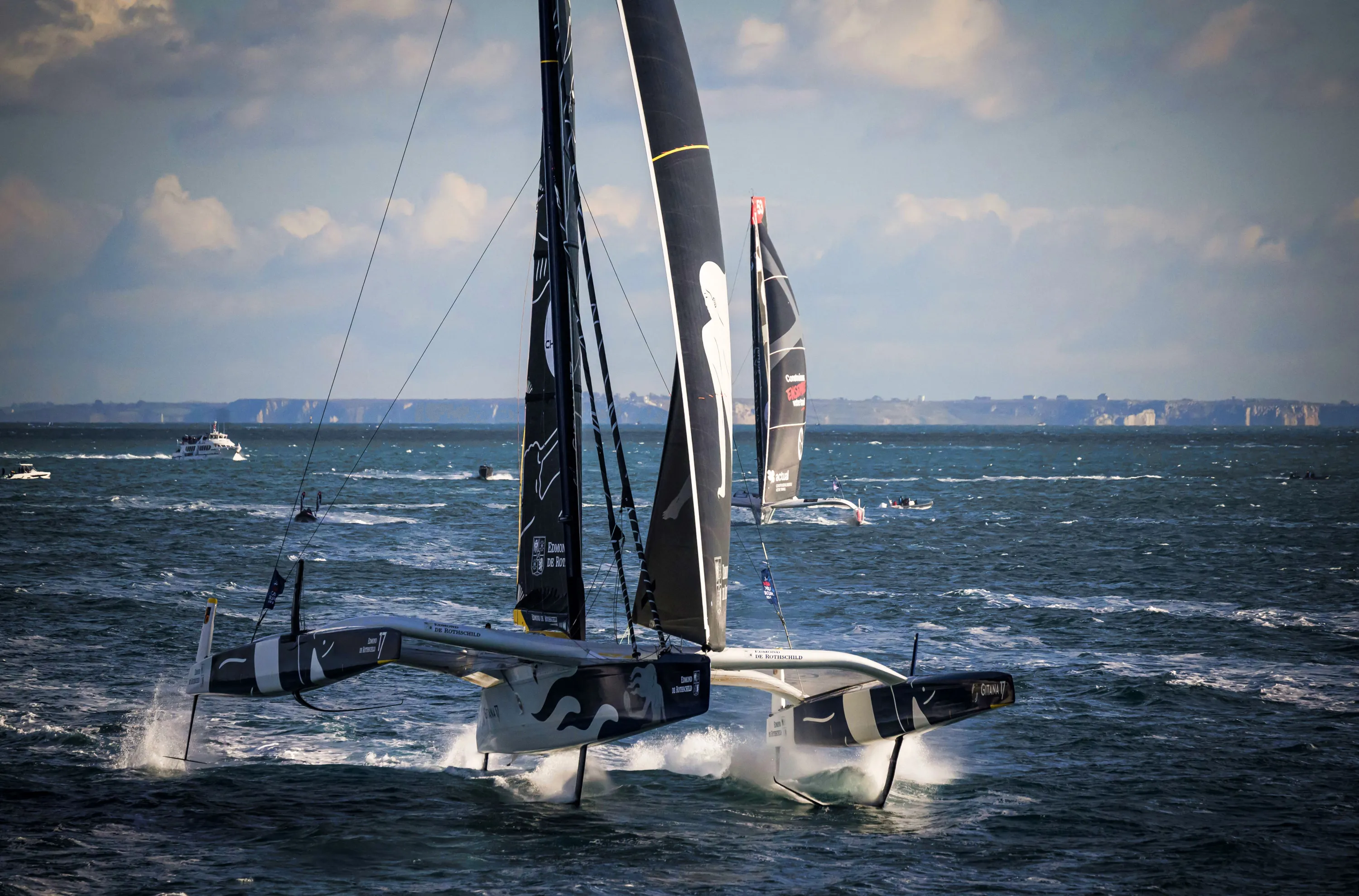 French skipper Charles Caudrelier sails his Ultim multihull Gitana - Edmond de Rothschild after the start of the Arkea Ultim Challenge, a solo round-the-world race on a multihull, off the coast of Brest, on January 7, 2024. The Arkea Ultim challenge around-the-world-solo sailing race will start in Brest, western France, on January 7, 2024, as the first solo round-the-world race on a multihull. (Photo by Loic Venance/AFP)
