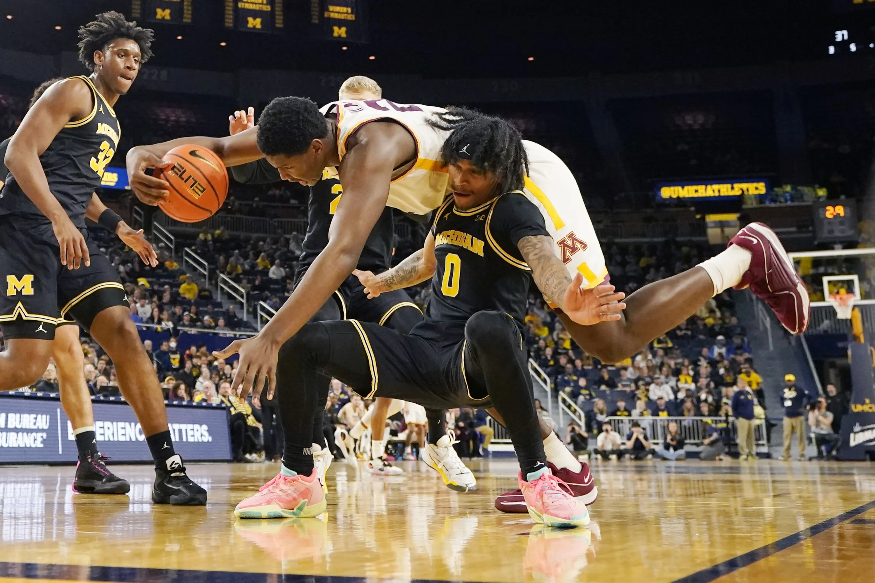 Minnesota forward Pharrel Payne (21) falls on Michigan guard Dug McDaniel (0) during the first half of an NCAA college basketball game, Thursday, January 4, 2024, in Ann Arbor, Mich. (Photo by Carlos Osorio/AP Photo)