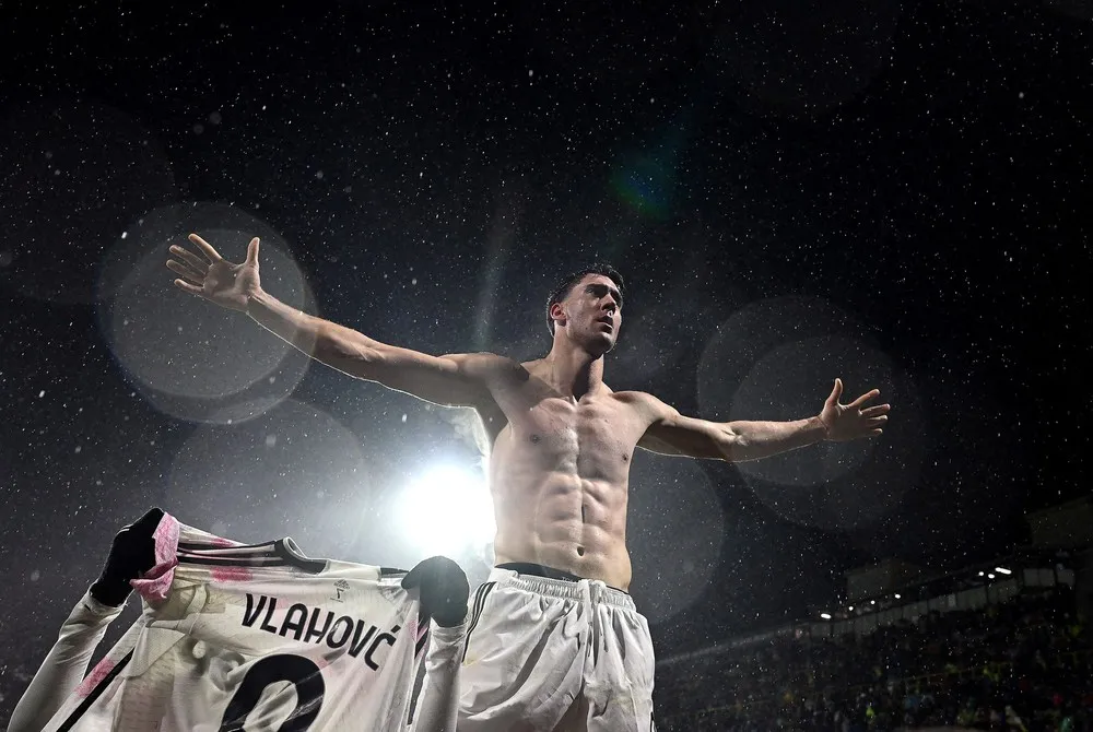 Dusan Vlahovic of Juventus FC celebrates after scoring second goal during the Serie A match between US Salernitana and Juventus FC at Stadio Arechi on January 7, 2024 in Salerno, Italy. (Photo by Alberto Lingria/Reuters)