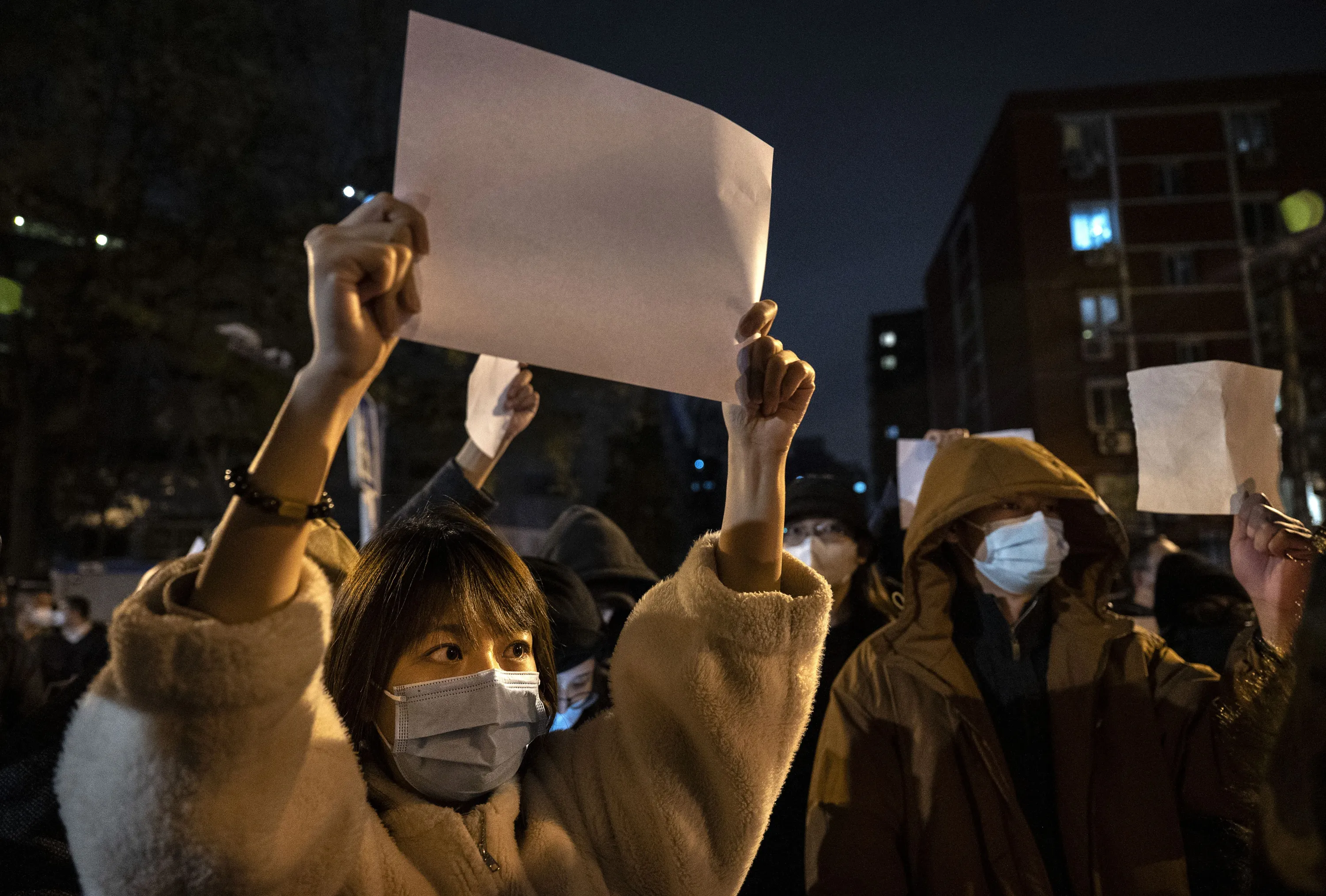 Protesters hold up pieces of paper against censorship and China's strict zero COVID measures on November 27, 2022 in Beijing, China. Protesters took to the streets in multiple Chinese cities after a deadly apartment fire in Xinjiang province sparked a national outcry as many blamed COVID restrictions for the deaths. (Photo by Kevin Frayer/Getty Images)