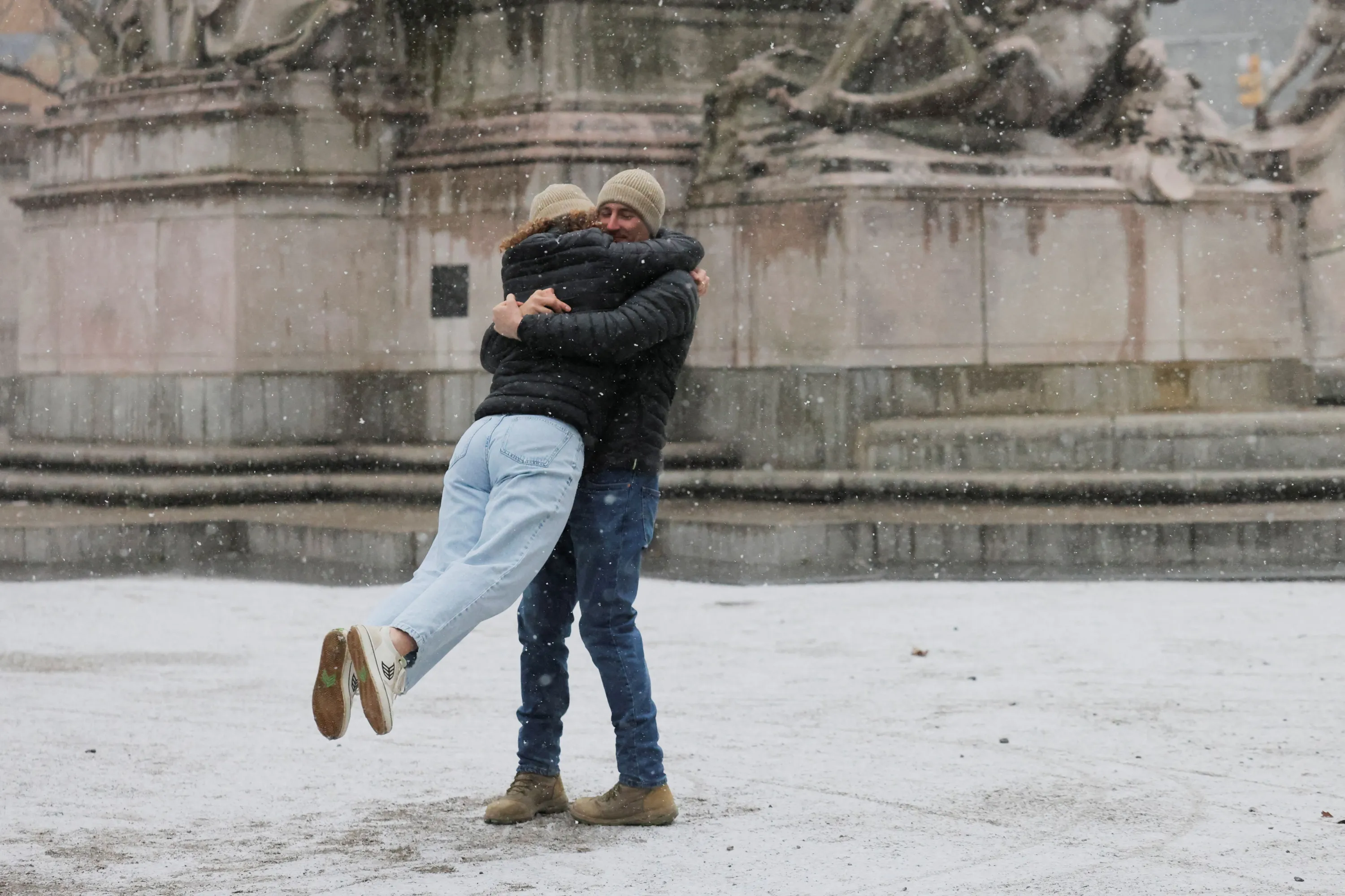 Two people embrace as snow falls in New York City on January 6, 2024. (Photo by Andrew Kelly/Reuters)