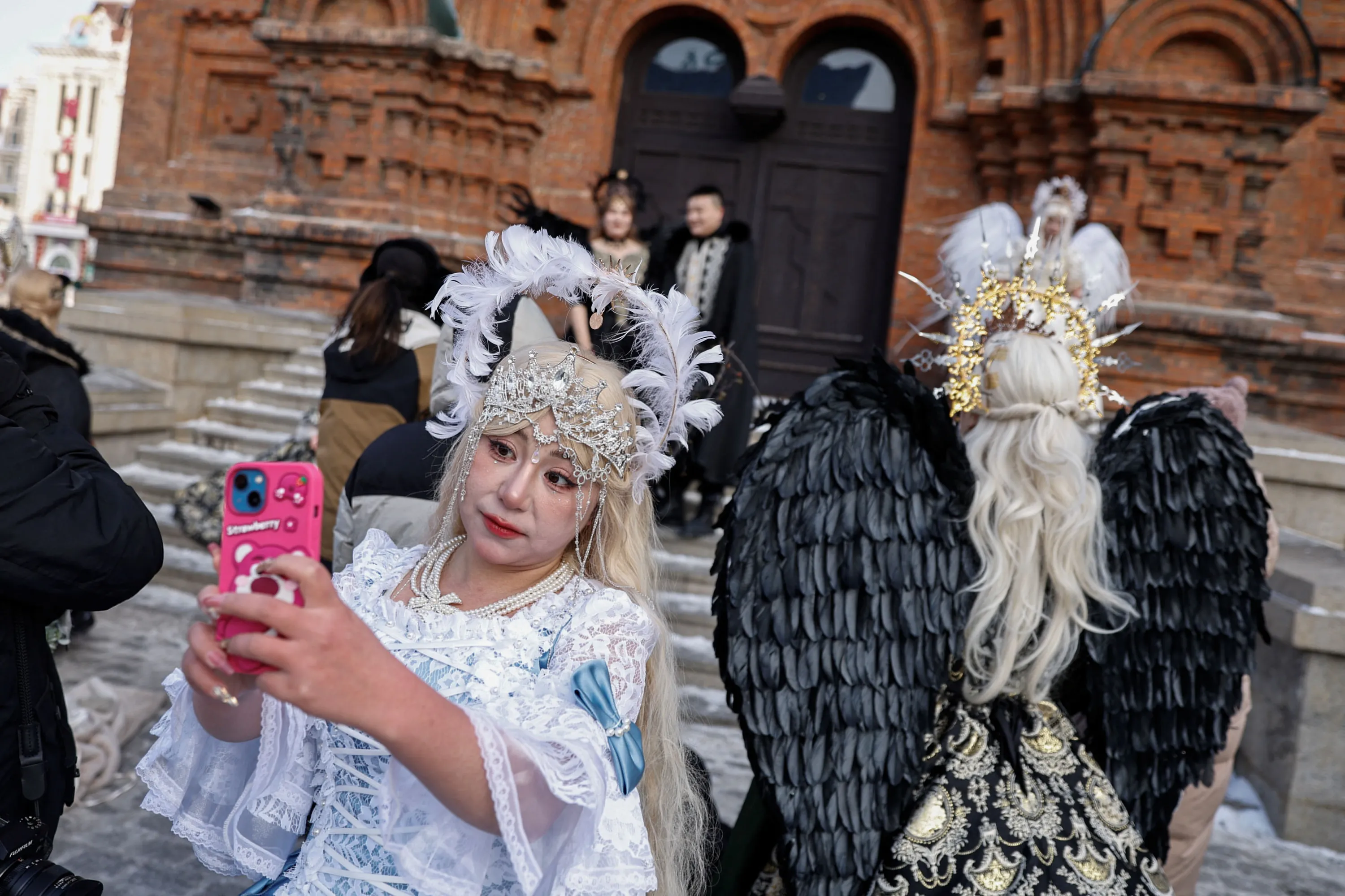 A woman wearing a costume takes selfies while waiting for a photo shooting session in front of the Saint Sophia Cathedral in Harbin, Heilongjiang province, China on January 5, 2024. (Photo by Tingshu Wang/Reuters)