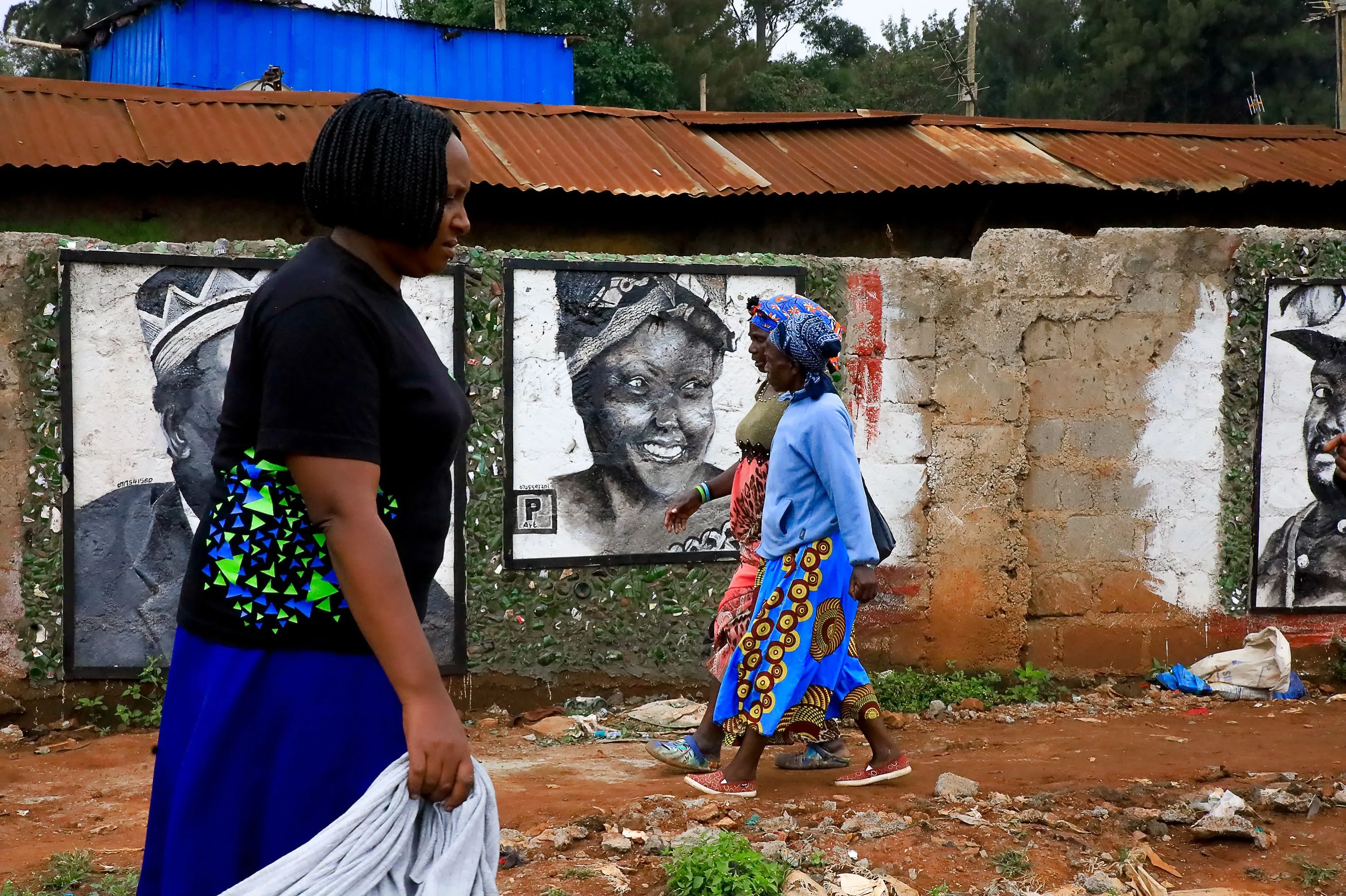Women walk past wall art murals created by youths from The Rockers movement of Kibera Slum on January 10, 2024 in Nairobi, Kenya. In the heart of Kibera Slum, a youth movement named The Rockers is planting seeds of change by creating murals and building social amenities through recycling. (Photo by Donwilson Odhiambo/Getty Images)