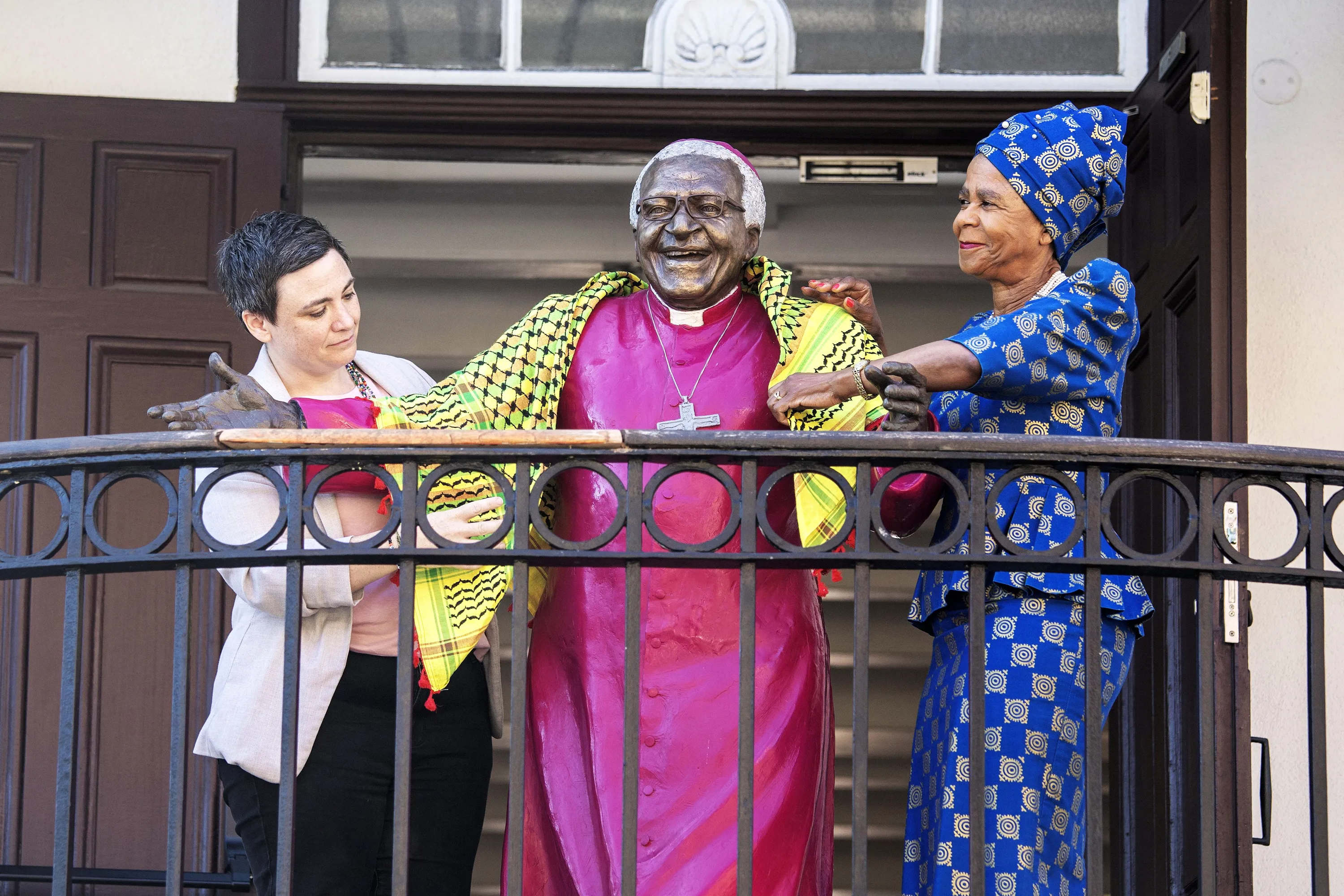 Chairperson of the Archbishop Desmond Tutu Intellectual Property Trust Mamphela Ramphele (R) and Chief Executive of the Desmond & Leah Tutu Legacy Foundation, Janet Jobson (L), put a Palestinian scarf with the African colours produced in Gaza, on a life-size statue of the Archbishop, unveiling the installation which will stand in protest during office hours on the balcony of the Desmond and Leah Tutu Legacy foundation in Cape Town on January 12, 2024. A statue of South African Archbishop Desmond Tutu wearing a Palestinian scarf is to symbolise his decades-long work championing justice for Palestinians, his foundation said. (Photo by Gianluigi Guercia/AFP Photo)
