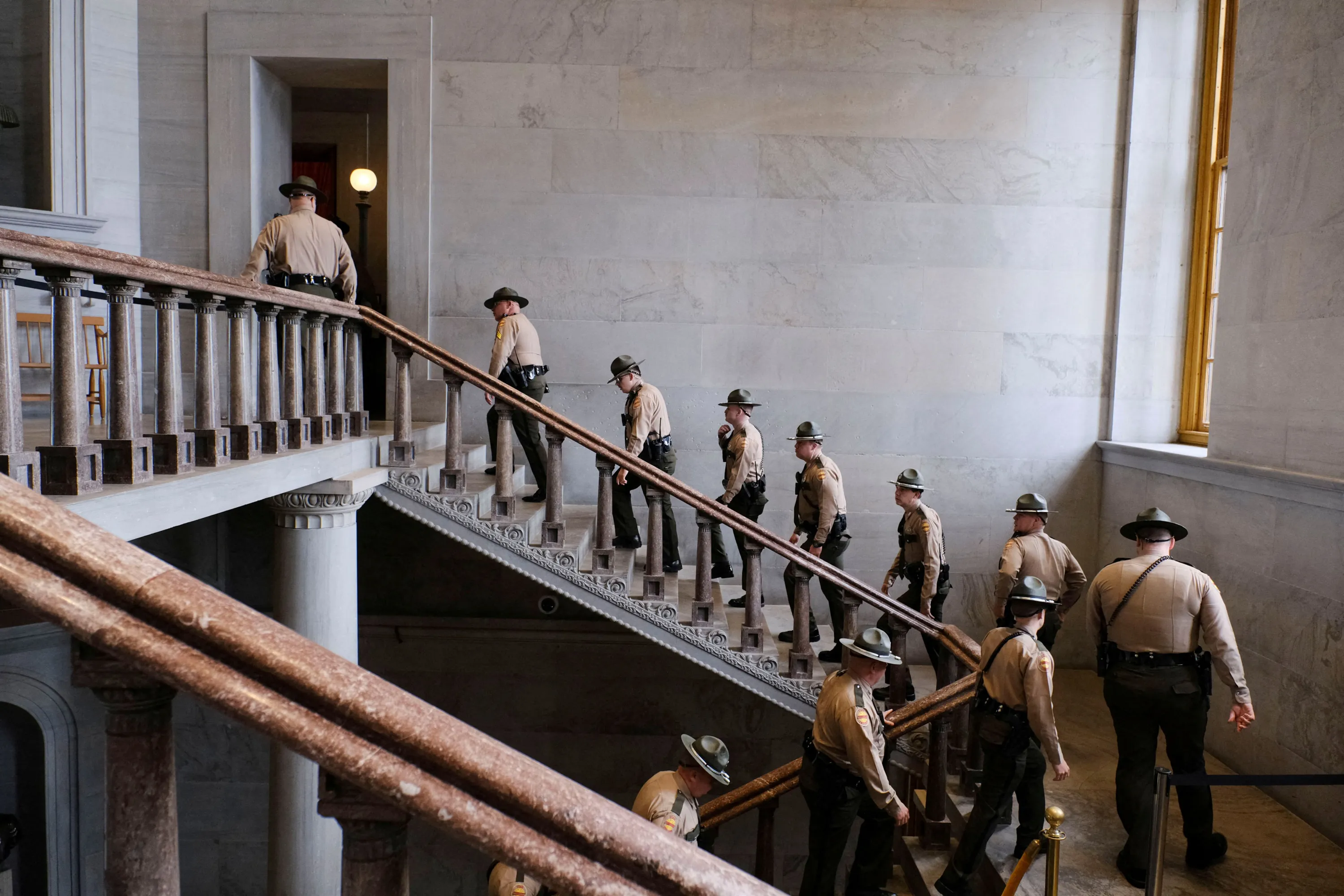 Tennessee State Troopers climb the steps of the rotunda of the Tennessee State Capitol, ahead of the the start of the legislative session months after the Covenant School shooting and protests rocked the state capitol in Nashville, Tennessee, U.S., January 9, 2024. (Photo by Kevin Wurm/Reuters)