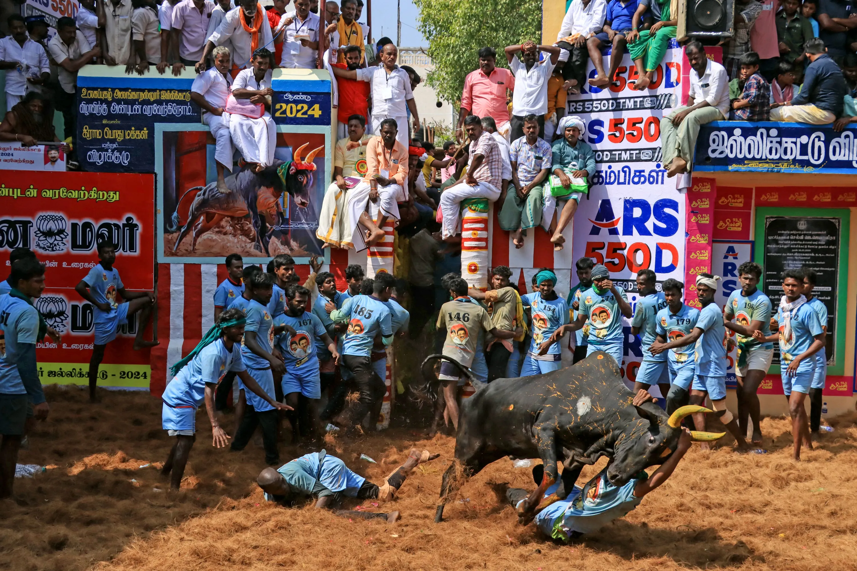Participants try to control a bull during an annual bull-taming festival “Jallikattu” in the Alanganallur village of Madurai district on January 17, 2024. (Photo by AFP Photo)