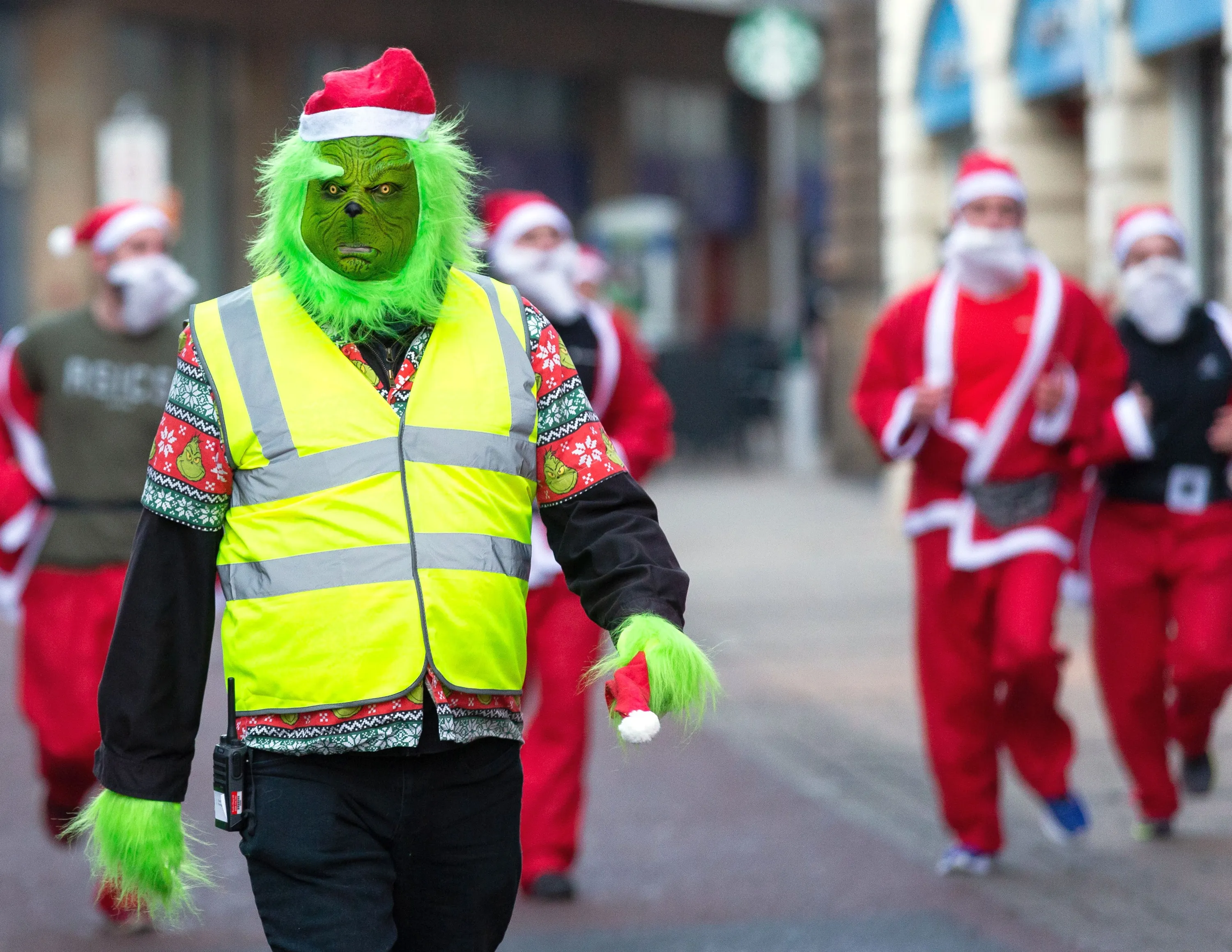 A person dressed in a Grinch costume takes part in the charity Santa Dash in Leeds, Britain, 11 December 2022. More than 500 runner took part in the event which is organized to raise funds for the St. Gemma's Hospice, a charity providing support for people in Leeds with life-threatening illnesses. (Photo by Adam Vaughan/EPA/EFE)