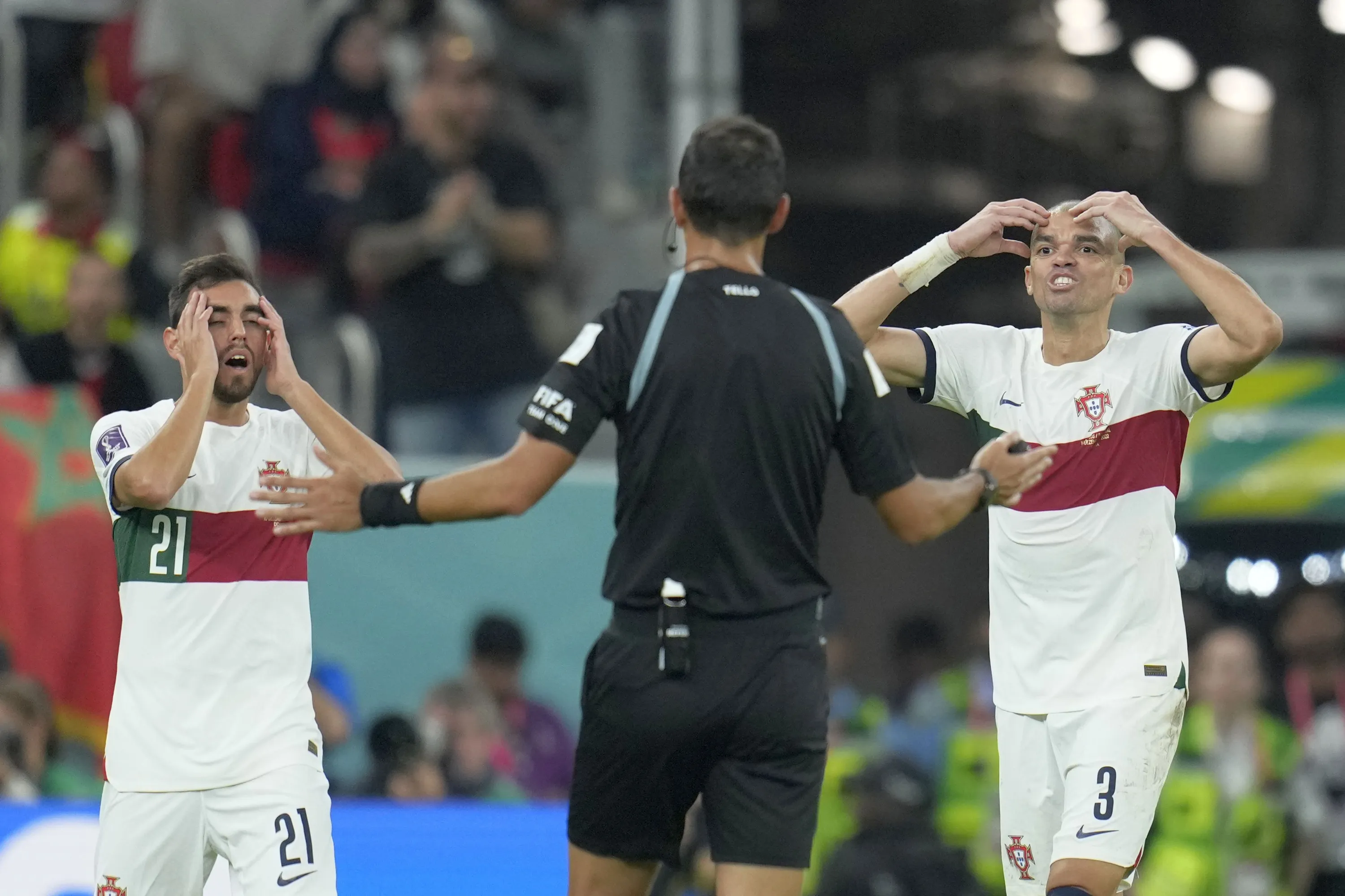 Portugal's Ricardo Horta, left, and Portugal's Pepe gestures to referee Facundo Tello from Argentina during the World Cup quarterfinal soccer match between Morocco and Portugal, at Al Thumama Stadium in Doha, Qatar, Saturday, December 10, 2022. (Photo by Ricardo Mazalan/AP Photo)