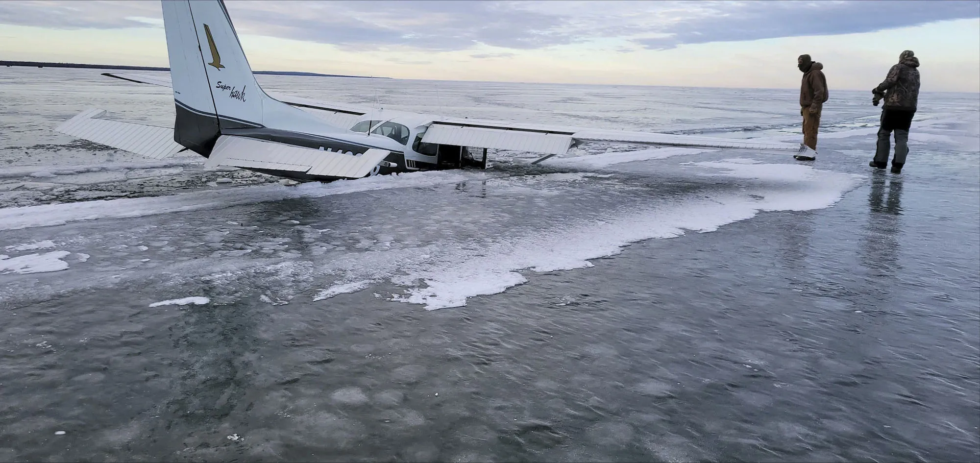 This December 19, 2023 photo provided by the Beltrami County Sheriff's Office in Minnesota shows a plane that fell through ice on Upper Red Lake in Washkish, Minn. (Photo by Beltrami County Sheriff's Office via AP Photo)