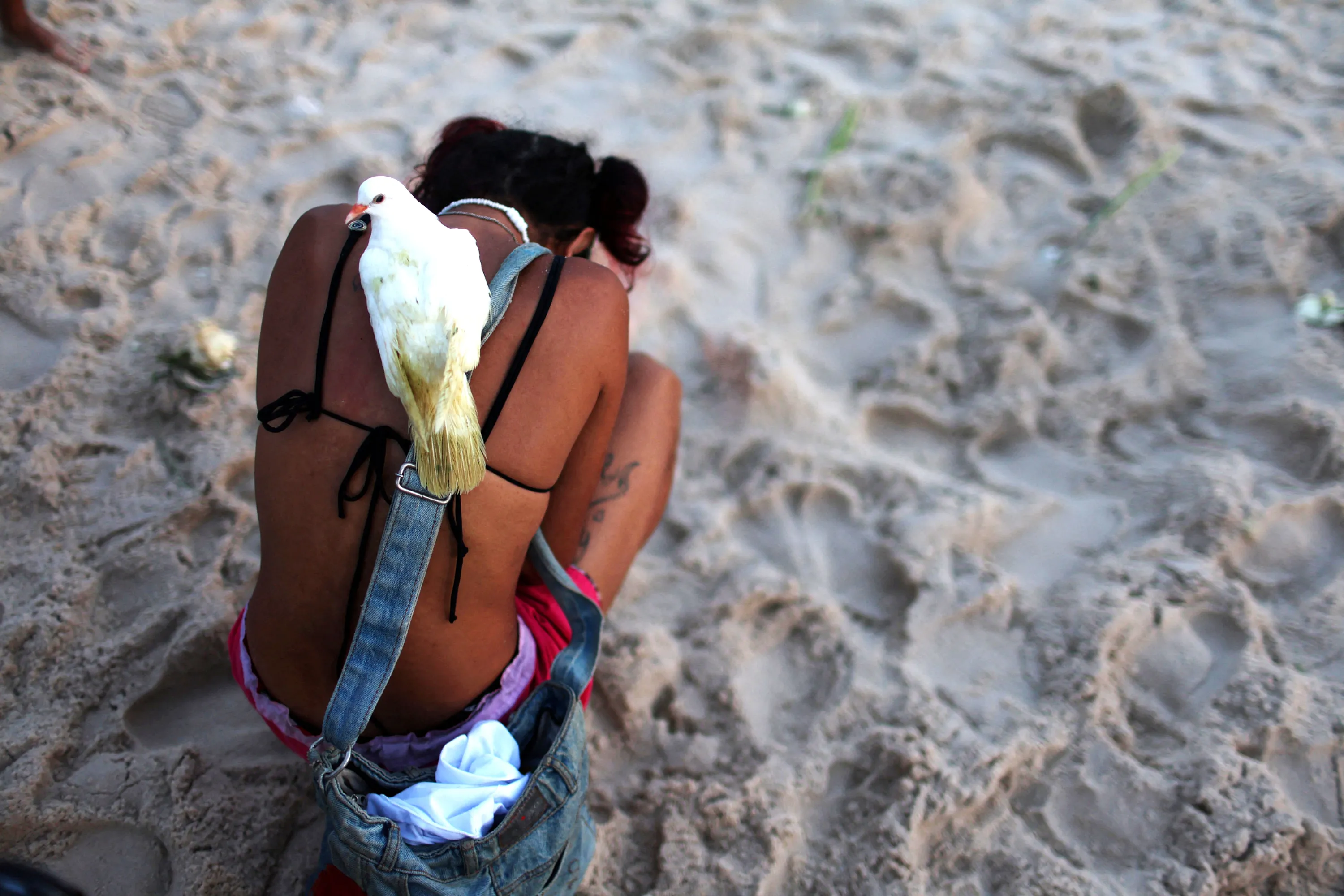 A woman with a dove on her back pays tribute to Yemanja, goddess of the sea, during a traditional New Year's Eve celebration in Copacabana Beach in Rio de Janeiro, Brazil on December 29, 2023. (Photo by Pilar Olivares/Reuters)