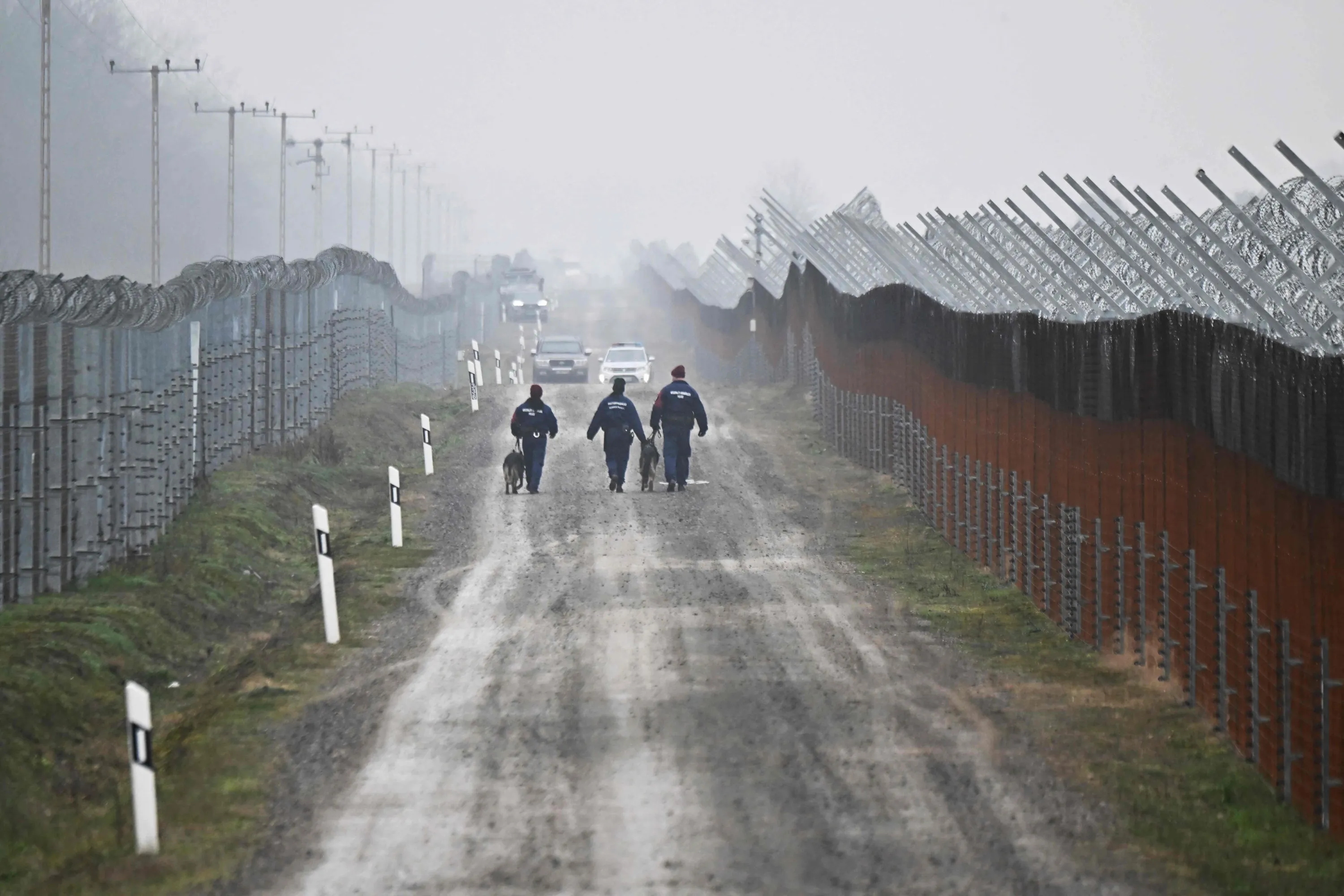 Hungarian border police officiers patrol on December 15, 2022 at the Hungarian-Serbian border, close to Kelebia village. In August 2022, the Hungarian government decided to strengthen the already existing 165-kilometer security border fence and build a new border protection system at the south part of the border. (Photo by Attila Kisbenedek/AFP Photo)