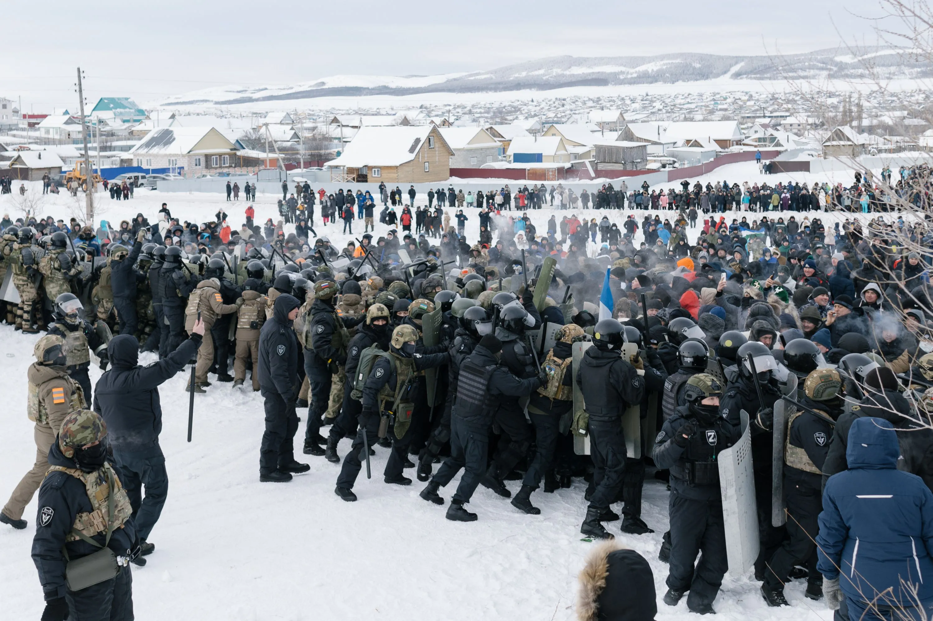 Protesters and riot police clash in the town of Baymak in Russia's central Bashkortostan region on January 17, 2024, after a court sentenced a local activist to four years in prison. Fail Alsynov, who campaigns against gold mining in the Urals region and advocates for the protection of the large ethnic Bashkir population's language, was sentenced for “inciting hatred” in the town of Baymak. (Photo by Anya Marchenkova/AFP Photo)
