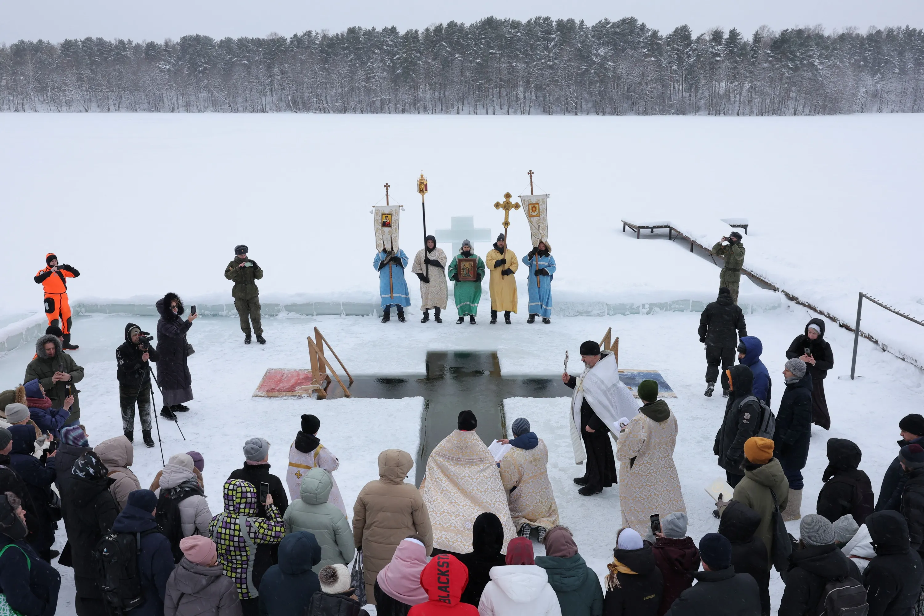 A priest blesses water during celebrations of the Orthodox Christian feast of Epiphany in the town of Sertolovo in the Leningrad Region, Russia on January 19, 2024. (Photo by Anton Vaganov/Reuters)