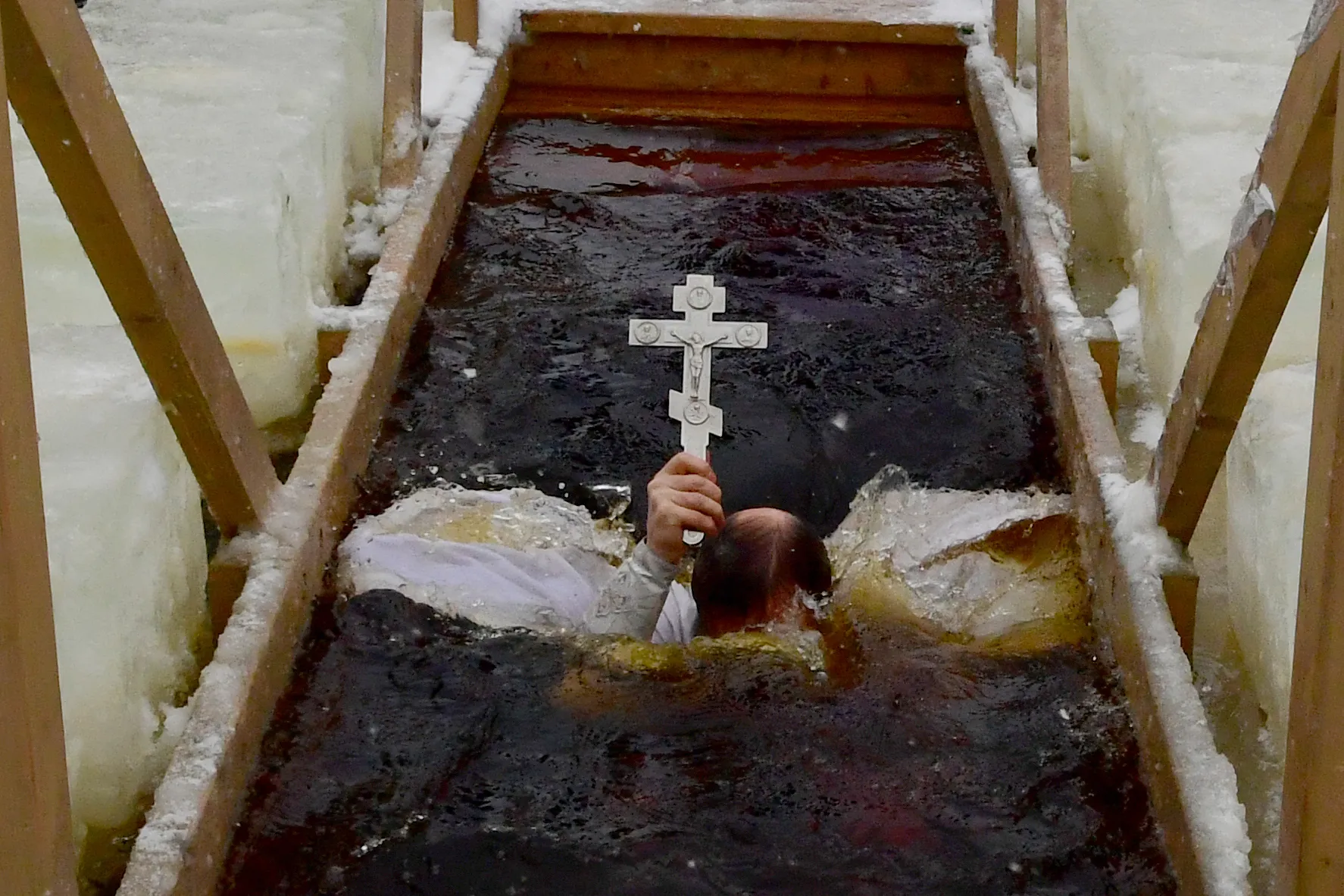 An Orthodox priest plunges into the icy waters of a lake during the celebration of the Epiphany holiday in the village of Orlino, Leningrad region, on January 19, 2024. Among Orthodox Christians, the feast of Epiphany celebrates the day the spirit of God descended upon believers in the shape of a dove during Jesus Christ's baptism in the river Jordan. (Photo by Olga Maltseva/AFP Photo)