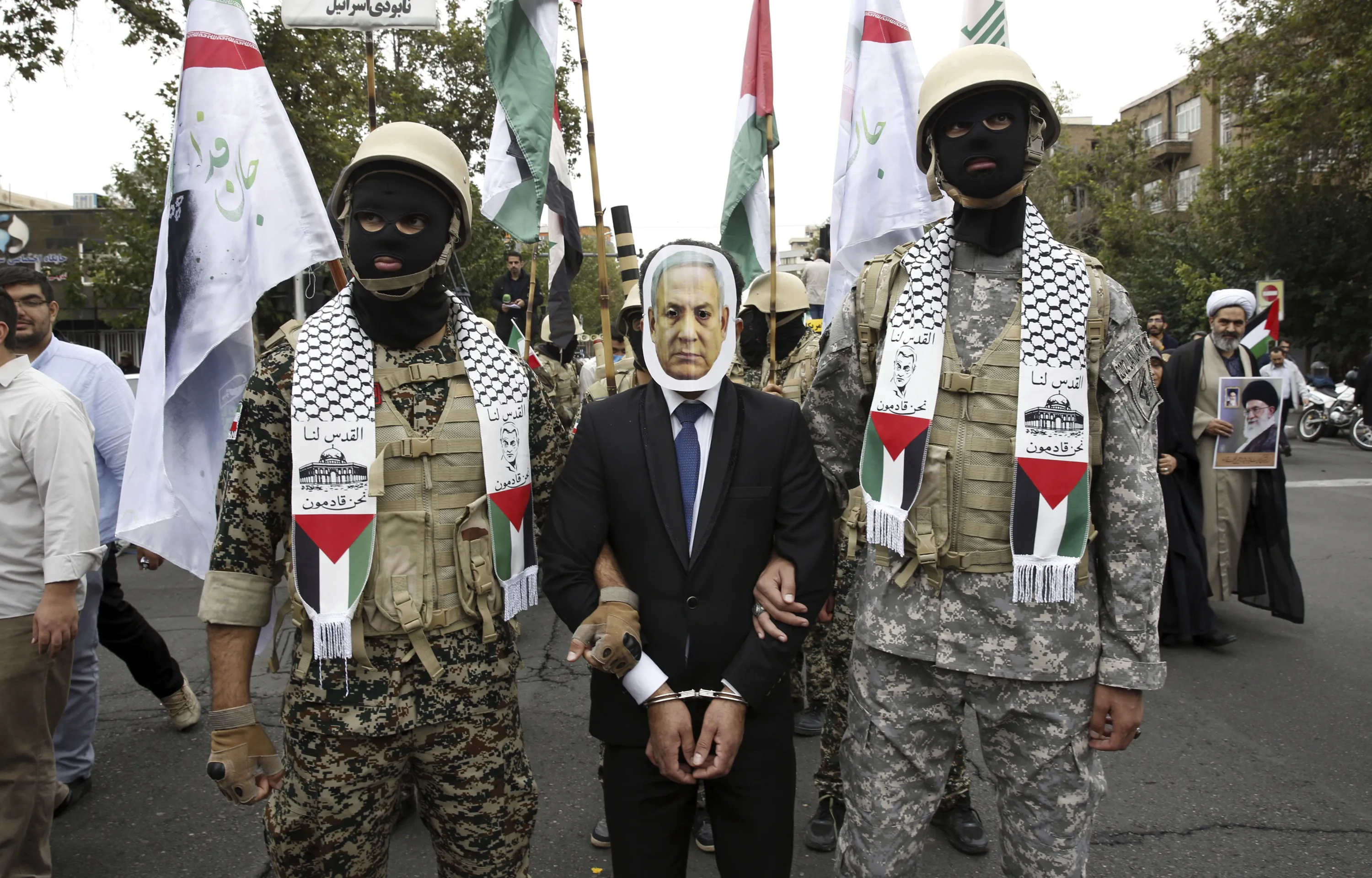 Iranian Basij paramilitary force members, in the style of the Palestinian and Lebanese militants, play the detention of the Israeli Prime Minister Benjamin Netanyahu during a pro-Palestinian rally after the Friday prayer in Tehran, Iran, Friday, October 13, 2023. (Photo by AP Photo/Stringer)