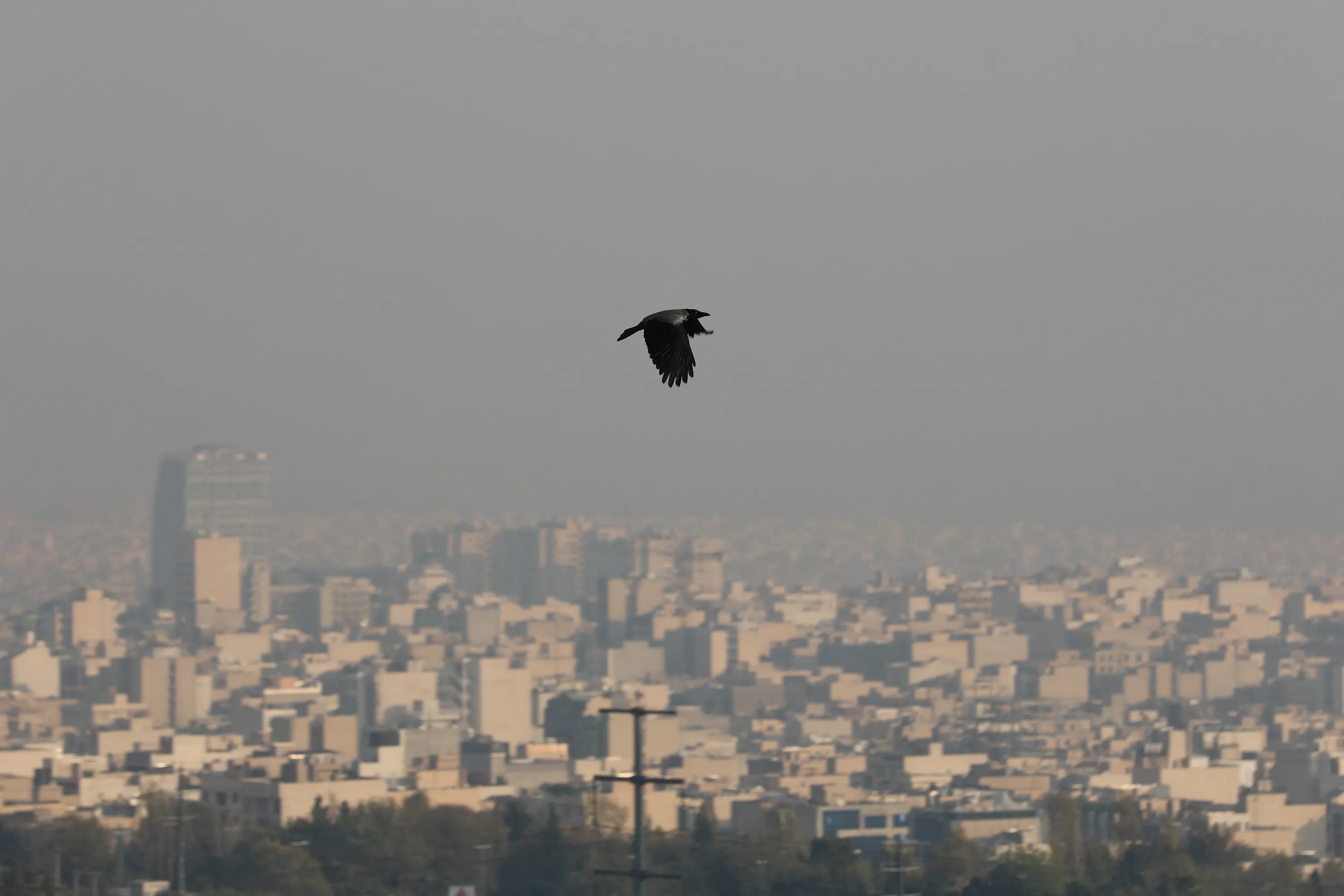 A bird flies above Tehran amid a thick layer of smog engulfing the city on November 14, 2023, as Iranian authorities urged young schoolchildren and many civil servants in the capital to stay at home due to a spike in air pollution levels. Tehran, a city of around nine million people, suffers from chronic air pollution and regularly ranks among the world's most polluted cities. (Photo by Atta Kenare/AFP Photo)