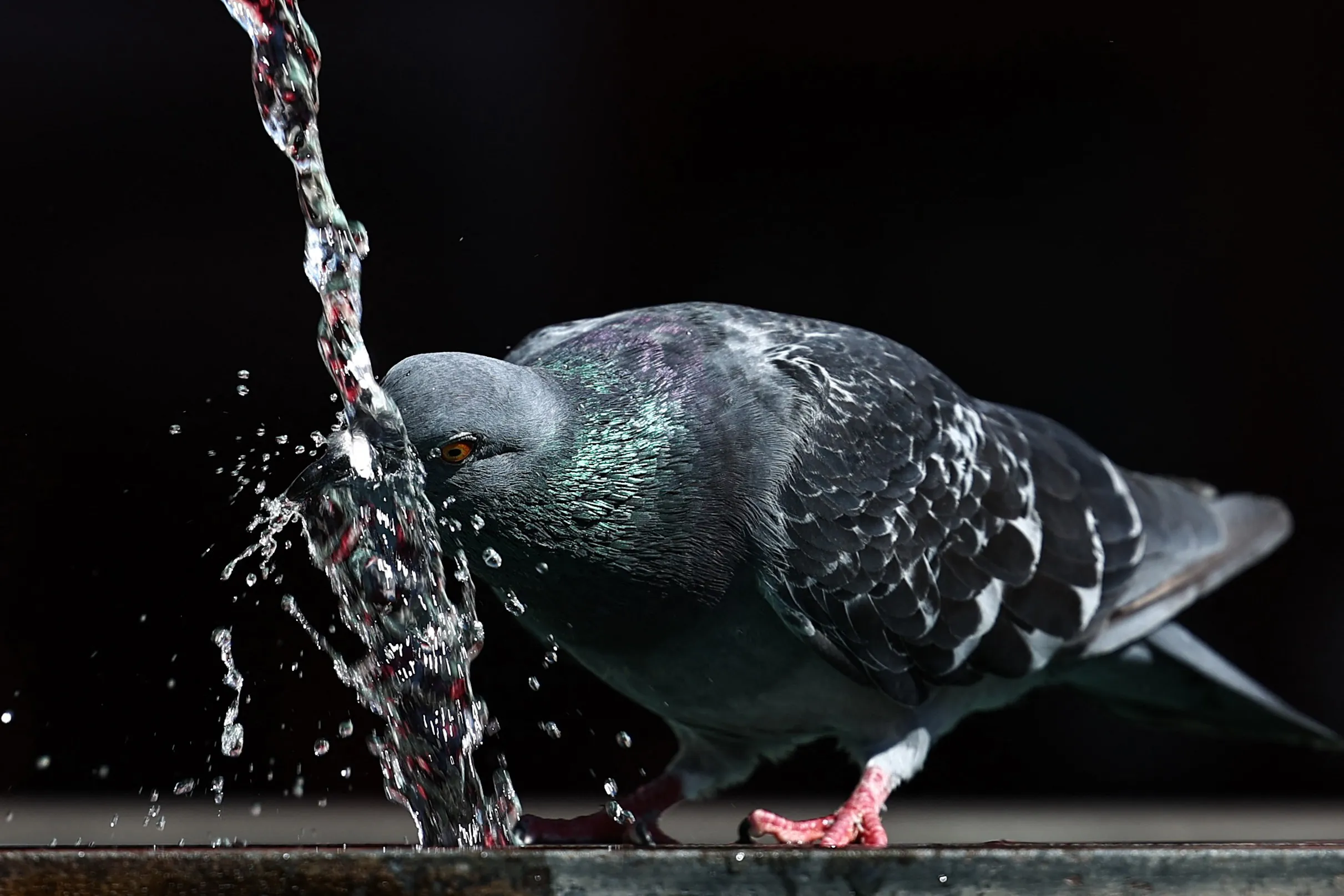 A pigeon drinks at a public fountain during a heatwave, in Mulhouse, eastern France, on August 22, 2023. (Photo by Sebastien Bozon/AFP Photo)