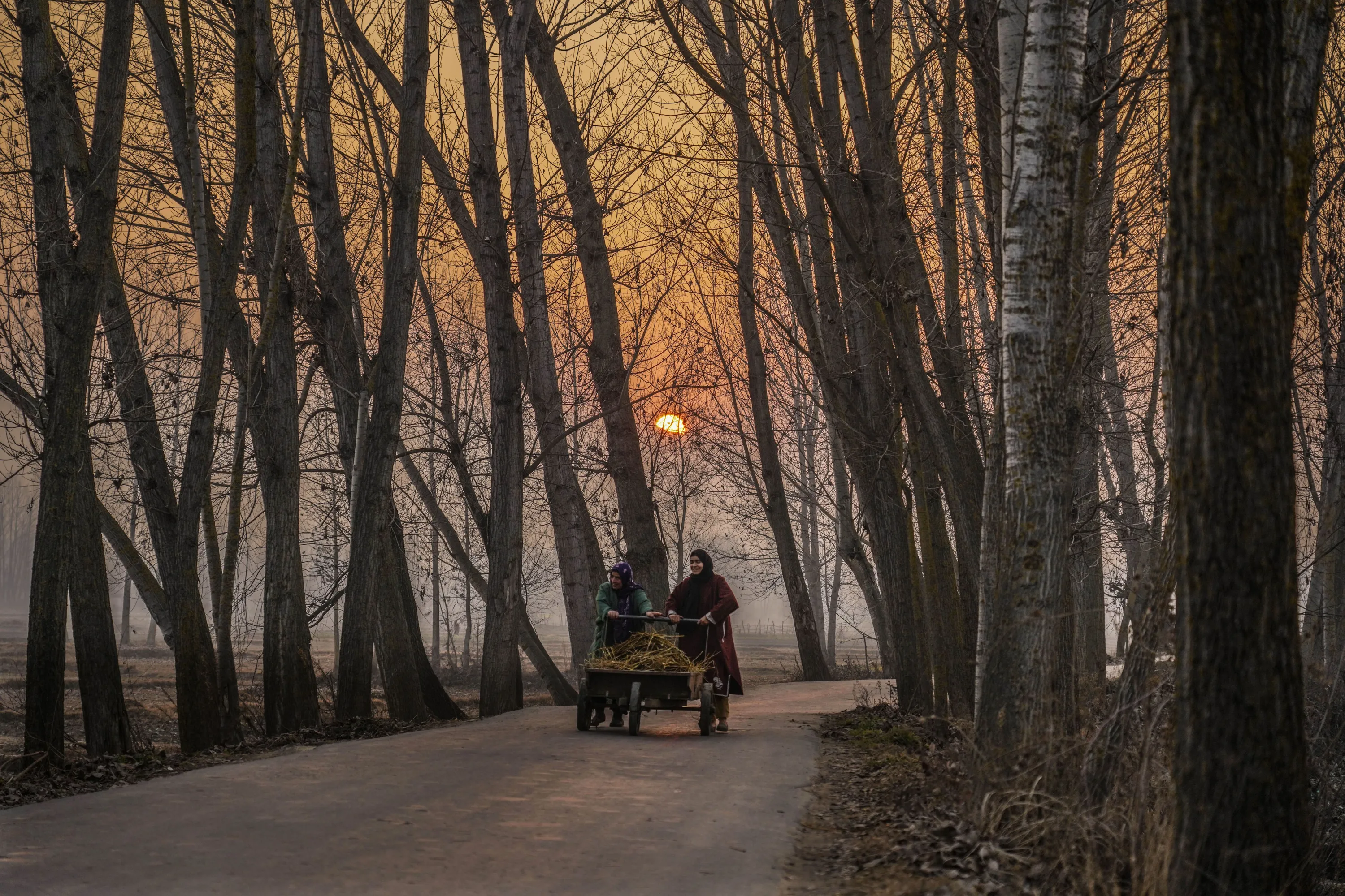 Kashmiri women push a handcart as the sun sets on a cold day on the outskirts of Srinagar, Indian controlled Kashmir, Sunday, January 14, 2024. (Photo by Mukhtar Khan/AP Photo)