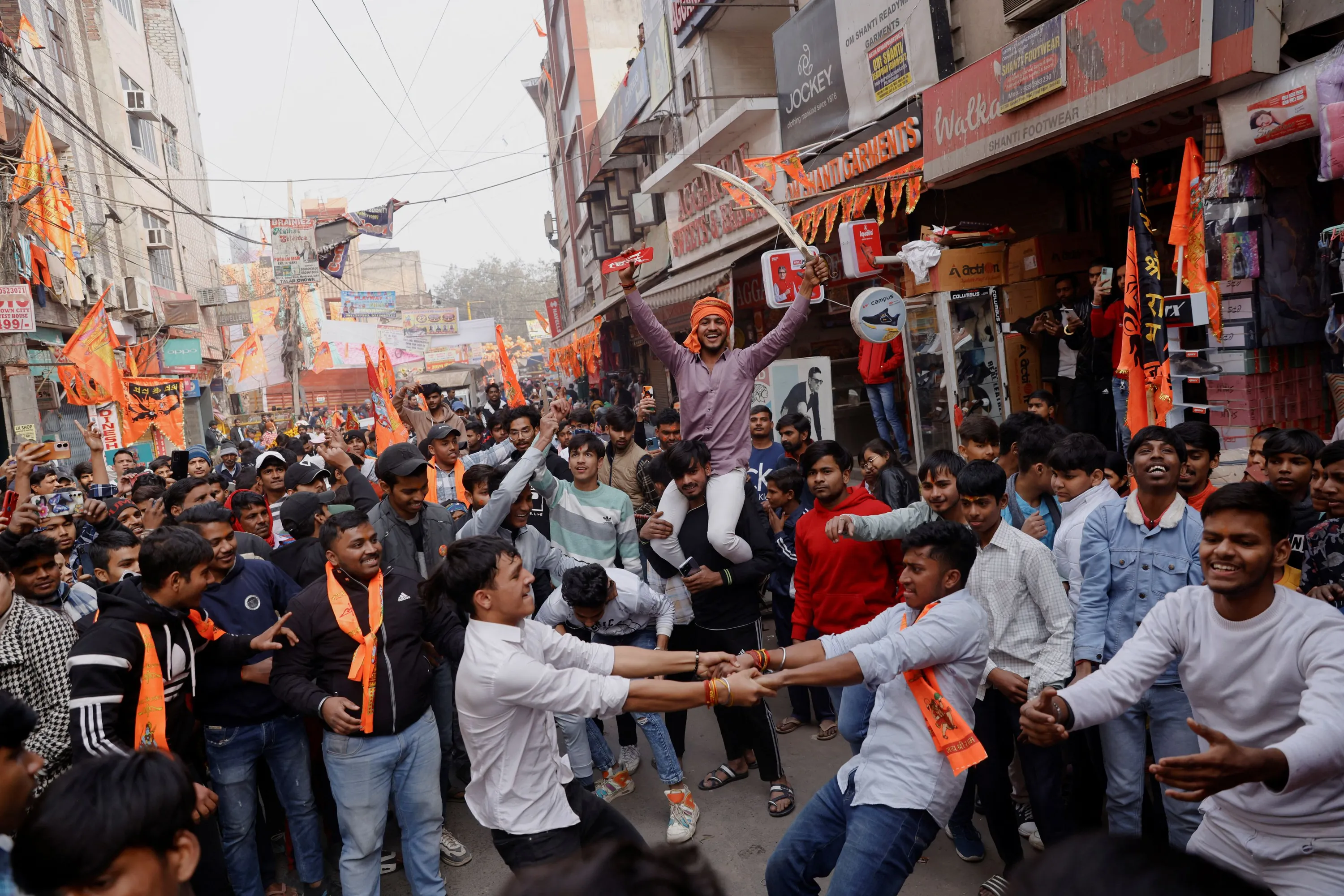 People celebrate the opening of the grand temple of the Hindu god Lord Ram in the northern town of Ayodhya, in a street in New Delhi, India, on January 22, 2024. (Photo by Anushree Fadnavis/Reuters)